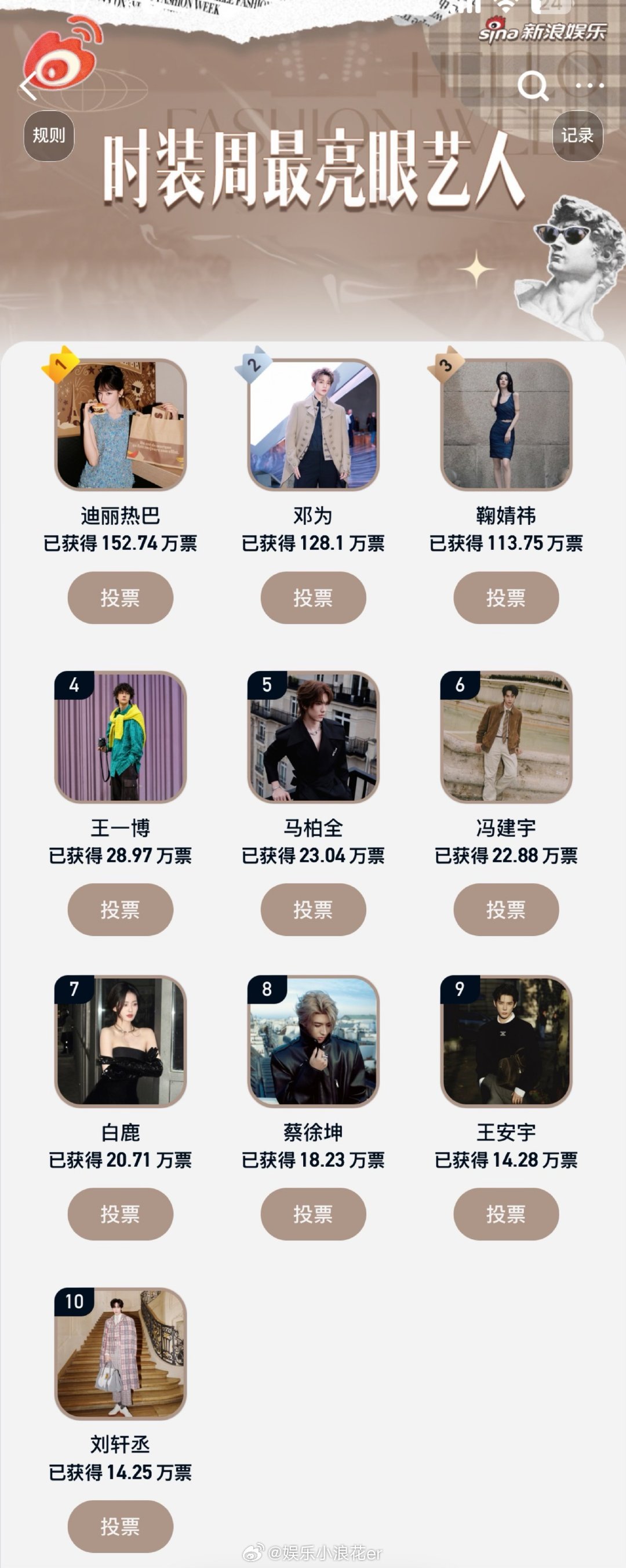 时装周最亮眼艺人TOP10冲刺阶段,火力全开!你的偶像正在候选席上,等待你最关