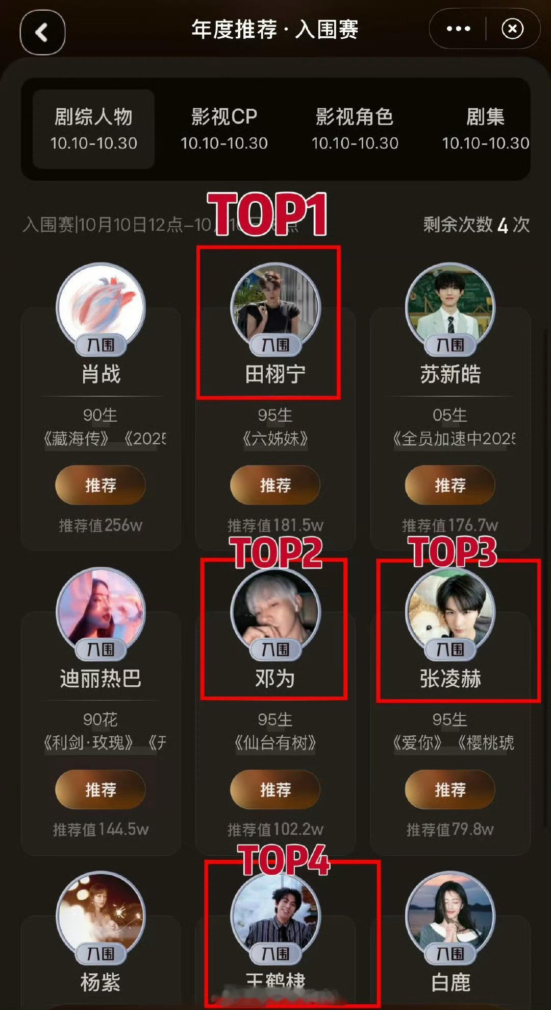 剧综人物排名里内娱前四95🥜分别是田栩宁、邓为、张凌赫、王鹤棣,这应该算是内娱