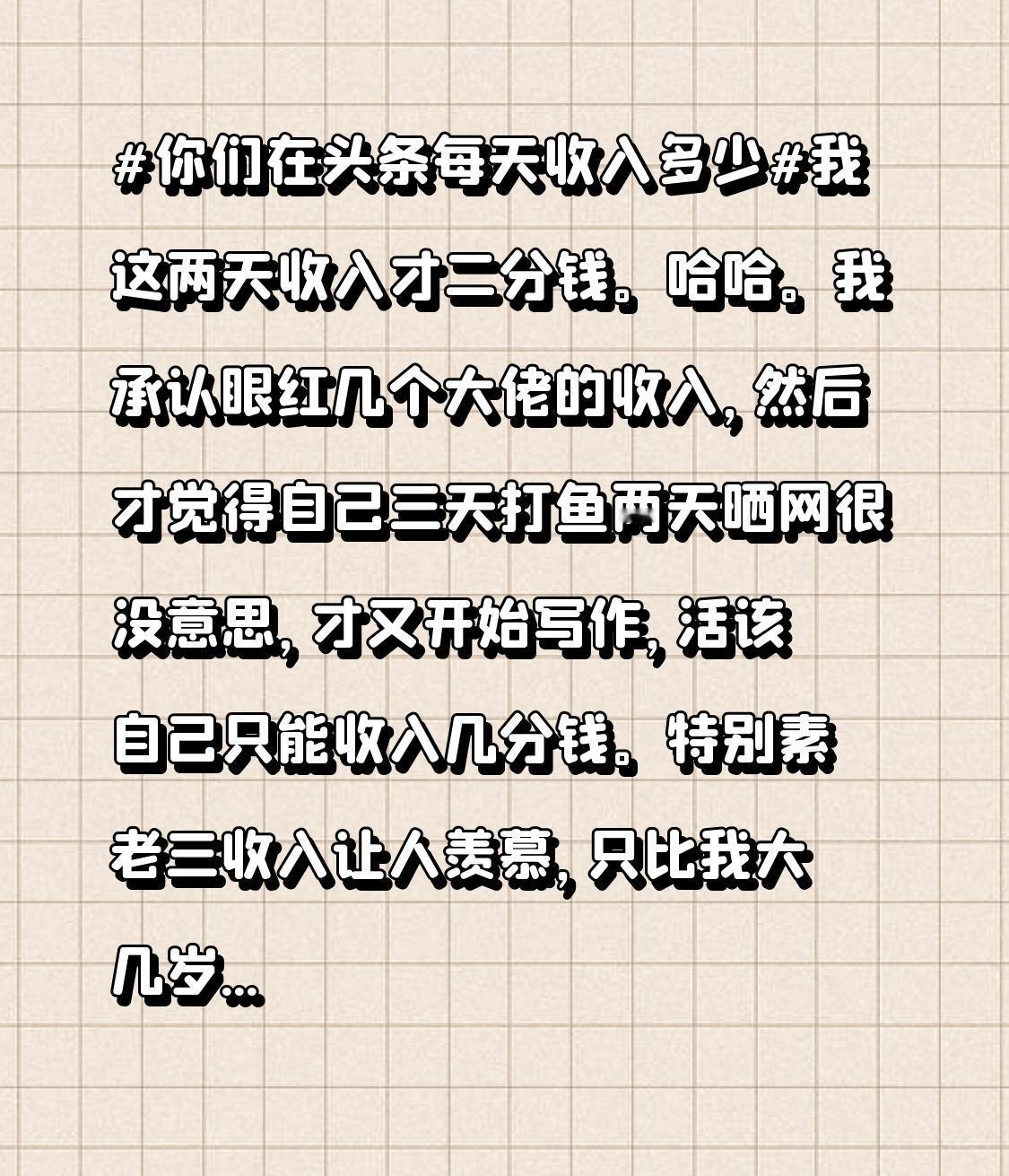 我这两天收入才二分钱。哈哈。 我承认眼红几个大佬的收入,然后才觉得自己三天打鱼两天晒网很没意思,才又开始写作,活该自己只能收入几分钱。 特别素老三收入让人羡慕,只比我大几岁,可她把写作当工作,她的素材不会枯竭,她的自律让她的爱好成为职业,也让她一个月有了五份收入。 该思考的是我们为什么不可能成为素老三第二,因为我的身上有很大的惰性。 我现在是这样想,有空就写点,有空看到有共鸣的为他们点赞。不知道会不会有人阅读和为我点赞! 一起加油吧!