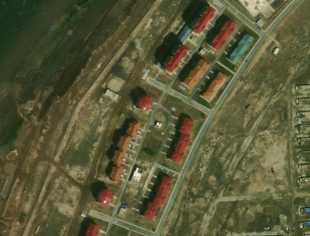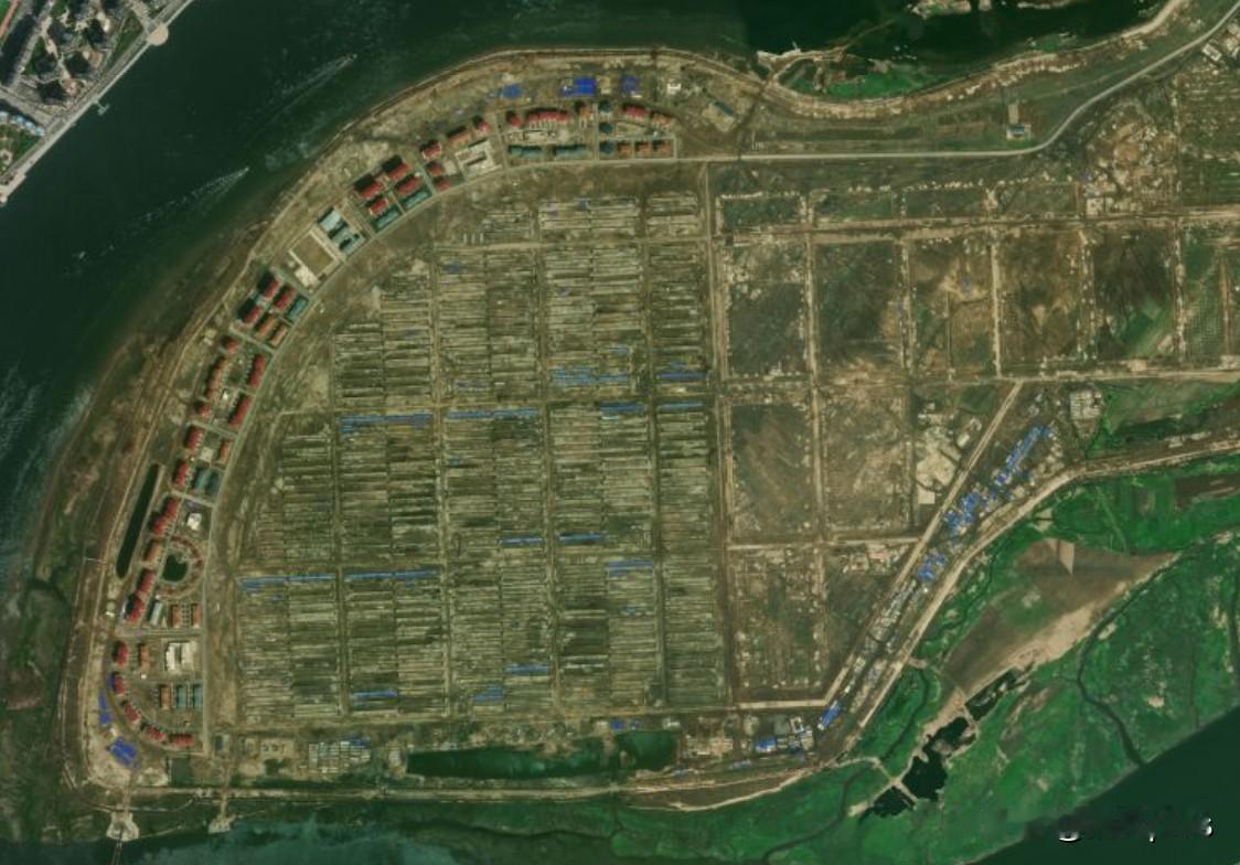 朝鲜在鸭绿江上的威化岛修建了很多漂亮的住宅。这些住宅大多面向江对岸的丹东,似乎试图打造朝鲜的江岸风景线。 但从卫星地图来看,这些建筑都是沿着岛西侧建的。两排或三排的低矮楼房,沿着威化岛西侧的弧线排开。 当中国游客在丹东这一侧或鸭绿江游船上再看威化岛,能够发现这些新建的居民楼,展示了朝鲜建设的新风貌。 卫星地图显示,朝鲜这些居民楼的容积率虽然高,楼间距宽,但几乎没有明显的停车场,也没有完全的柏油路面化,再远一些就变成了土路。公允地说,距离优质小区的建设标准还有一段差距。 不过,看起来这像是朝鲜对威化岛的大规模改造计划的一部分。去年威化岛等地遭遇洪水灾害,当地受灾严重。之后朝鲜对威化岛进行了灾后重建。 对比之前的卫星图(图6),最新的卫星图(图5)已经有了很大变化。威化岛中间的很多农村建筑已经消失,西南至东北走向的农田,变成了东西走向的条格状。岛上的居民可能搬迁到了新的楼房里,岛中间的区域看起来有新的规划。