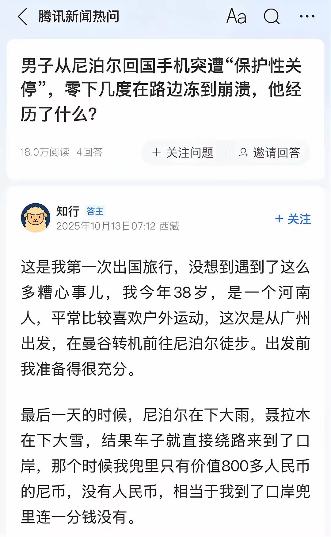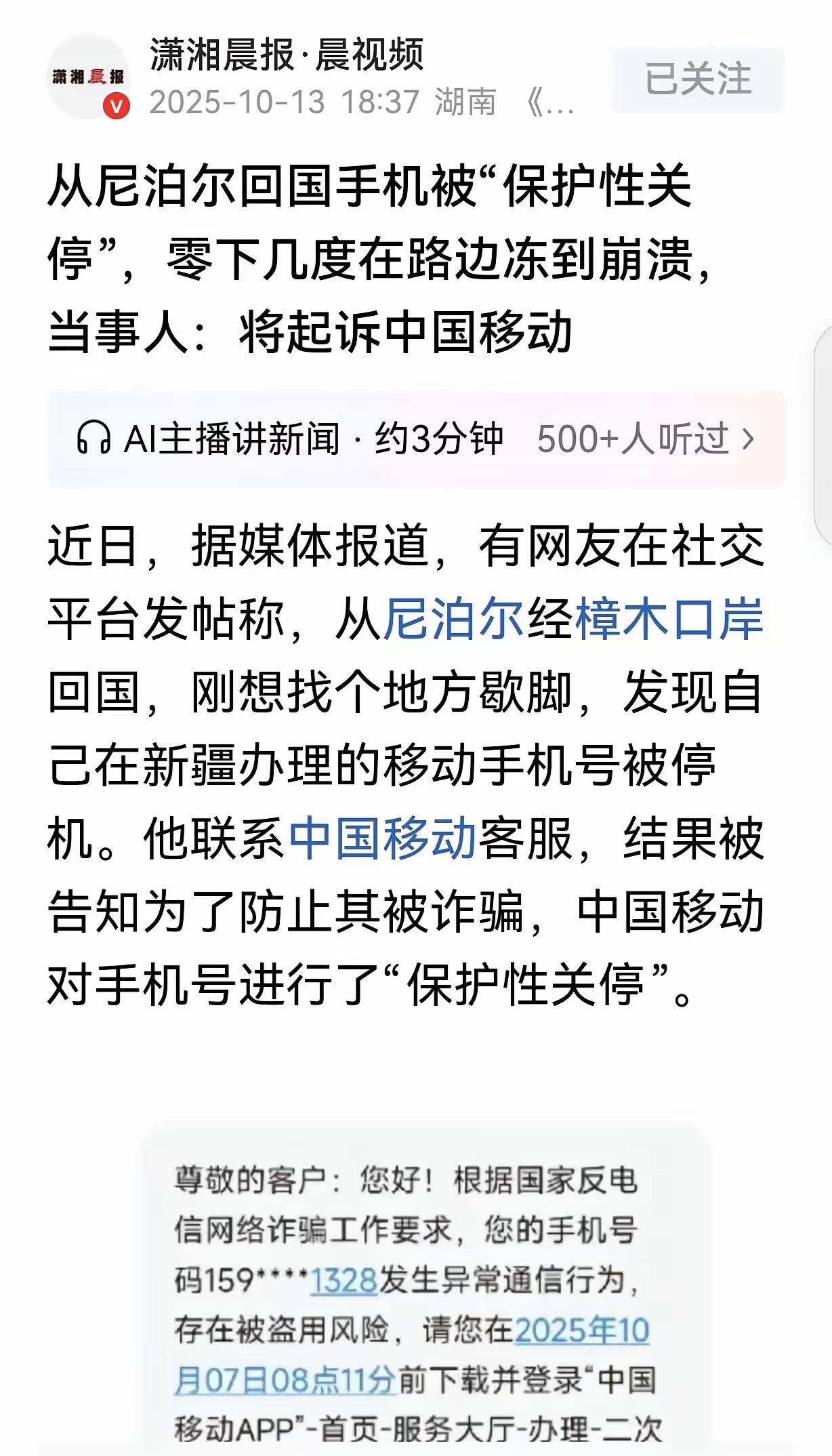 零下冻到崩溃!手机号被“保护”停机,移动这波操作真的“护”对了? 谁能想到,一场开心的尼泊尔 徒步之旅,会在回国时让河南人李先生栽在自己用了多年的手机号上? 在西藏樟木口岸,零下几度的大雪天里,他的新疆移动手机号突然停机,充了200块话费也没用,联系客服才知道是“保护性关停”,怕他被诈骗。可这“保护”也太不管人死活了——他身上只有800多块尼币,连打车钱都没有,就穿件冲锋衣在雪地里冻得发抖,只求客服开4小时网找住处,结果开了5分钟就关,换个客服更是直接拒绝。 找当地营业厅,被告知新疆办的卡只能回新疆解,这不是把人往绝路上逼吗?最后还是靠民警帮忙才找到落脚地,无奈办了张新电信卡。更气人的是,他要说法、要退话费、要赔交通费,客服说48小时回复,结果等了一周直接没人管,现在卡没解封,他只能弃号,还得准备起诉。 移动口口声声说“防诈骗”,可连提前通知都没有,停机后也不提供具体依据,这不就是侵犯消费者知情权吗?充值了却不给服务,紧急情况下连临时网络都不肯开,公平交易权更是无从谈起。所谓的“保护性关停”,要是只讲规则不讲人情,不顾用户在极端环境下的安全,那到底是“保护”还是“添乱”? 大家有没有遇到过类似的“保护性”服务?你觉得遇到这种紧急情况,运营商该先讲规定还是先保用户安全?来评论区说说你的经历和看法!