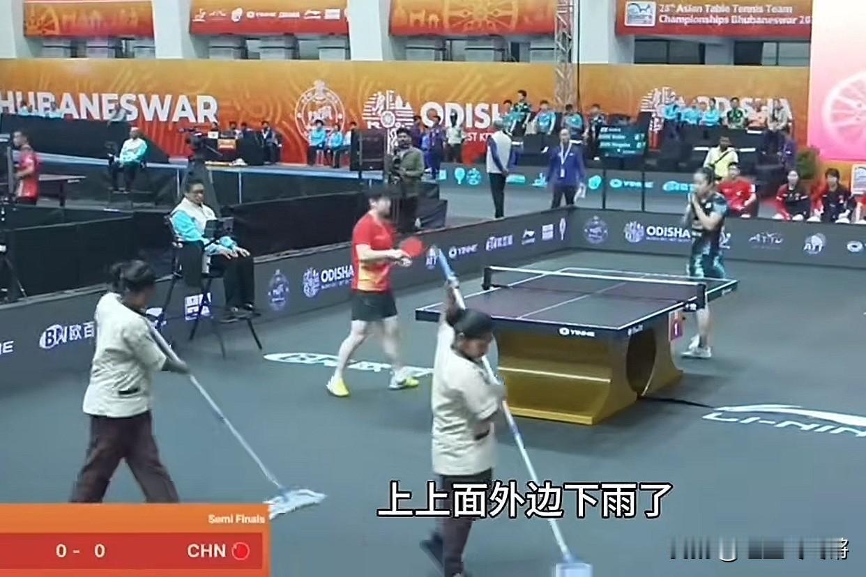 老天爷,印度亚锦赛的女团半决赛,中国对阵韩国那场,场馆屋顶漏得跟水帘洞似的,工作人员扛着拖把在球台边随时待命,成了赛场上最忙的 “编外选手”。 孙颖莎首盘对战申裕斌时,地板上的水渍直接影响了发球节奏,裁判不得不暂停比赛让擦地,结果这场原本紧凑的对决愣是被拖成了 “中场休息大乱斗”。 更绝的是,王曼昱的球拍胶皮因为潮湿打滑,首局直接被打懵,后来她只能一边打一边用干毛巾狂擦拍子,生生从 0-1 逆转到 3-1。 这场馆的 “奇葩操作” 其实早有前科。 赛前训练时,国乒队员就发现屋顶有鸽子筑巢,鸟粪时不时砸在球台上,逼得大家每次练球前先当 “铲屎官”。 结果到了正式比赛,鸽子虽然被防鸟网赶走了,屋顶却开始漏水。没想动吧,他们防鸟网是装上了,但防水工程压根没做,雨季一来直接 “水漫金山”。 更魔幻的是,主办方为了省钱,把原本承诺的中央空调换成了带冰块的电风扇,场馆温度白天稳超 33℃,湿度直逼 70%,运动员们打着球就跟蒸桑拿似的,脱水速度比击球频率还快。 要说最冤的还是转播镜头。为了避开漏水的主摄像区域,导播不得不把画面死死压在球台下方,观众只能看到运动员的上半身在 “旱地拔葱”,下半身却在湿漉漉的地板上 “凌波微步”,不知情的还以为在看《西游记》特效。 咱就说了,这比赛印度是非申办不可吗?放过大家吧