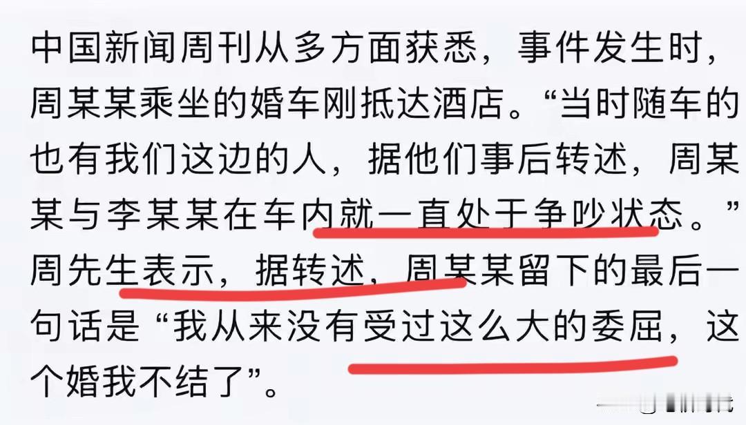 新郎跳河身亡真相大白!其父称儿子婚车内和新娘一直争吵,留下最后一句话。这句话信息量很大,女方想撇清关系。 10月9日,周某的遗体在大桥下游百米处被发现后,女方表示过会尽快去看望,不知有没去。 在当地政府的协调下,男女双方家属曾进行会面,会面时双方就事件责任认为在对方。 在婚礼当天,周某某和李某某在婚车里一路都在吵架。留下最后一句话:从没受过这么大委屈,这个婚我不结了。从这句话看出,他情绪已崩溃到极点。 在婚礼当天双方为什么而吵?恐怕女方是最清楚的。 一个真正爱你的女人绝不会为难你,反而会处处护着你,生怕娘家人委屈了自己的丈夫。 做为成年人,应该对自己及家庭负责,在结婚的车上争吵,意见达不成一致,完全可以取消或者延期举办。 你纵身一跳解脱了,家人怎么办?为了赌口气,确实不值,人生也没有重来的机会。苦了父母!