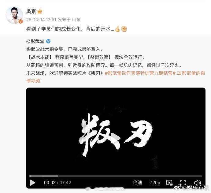 分享影武堂动作表演特训营短片,表示“看到了学员们的成长变化,背后的汗水…”