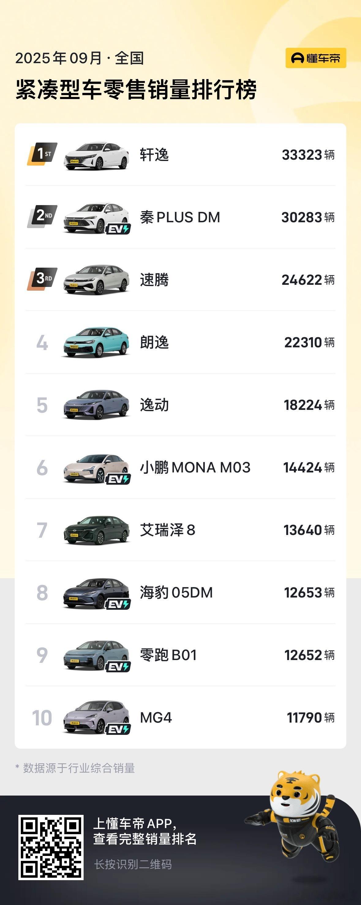 最新紧凑型车销量榜单来了!老牌车企回归,黑马连连,轩逸 以33323辆的月销成绩斩获总榜冠军,秦PLUS DM和速腾 紧随其后,位列第二、三名;纯电榜单中,日前炒得火热的新势力小鹏MONA M03取得冠军,让人意外的是,刚刚上市不久的名爵MG4 直接杀进前三,以11790辆的成绩,竟然压过比亚迪秦 PLUS EV一头。