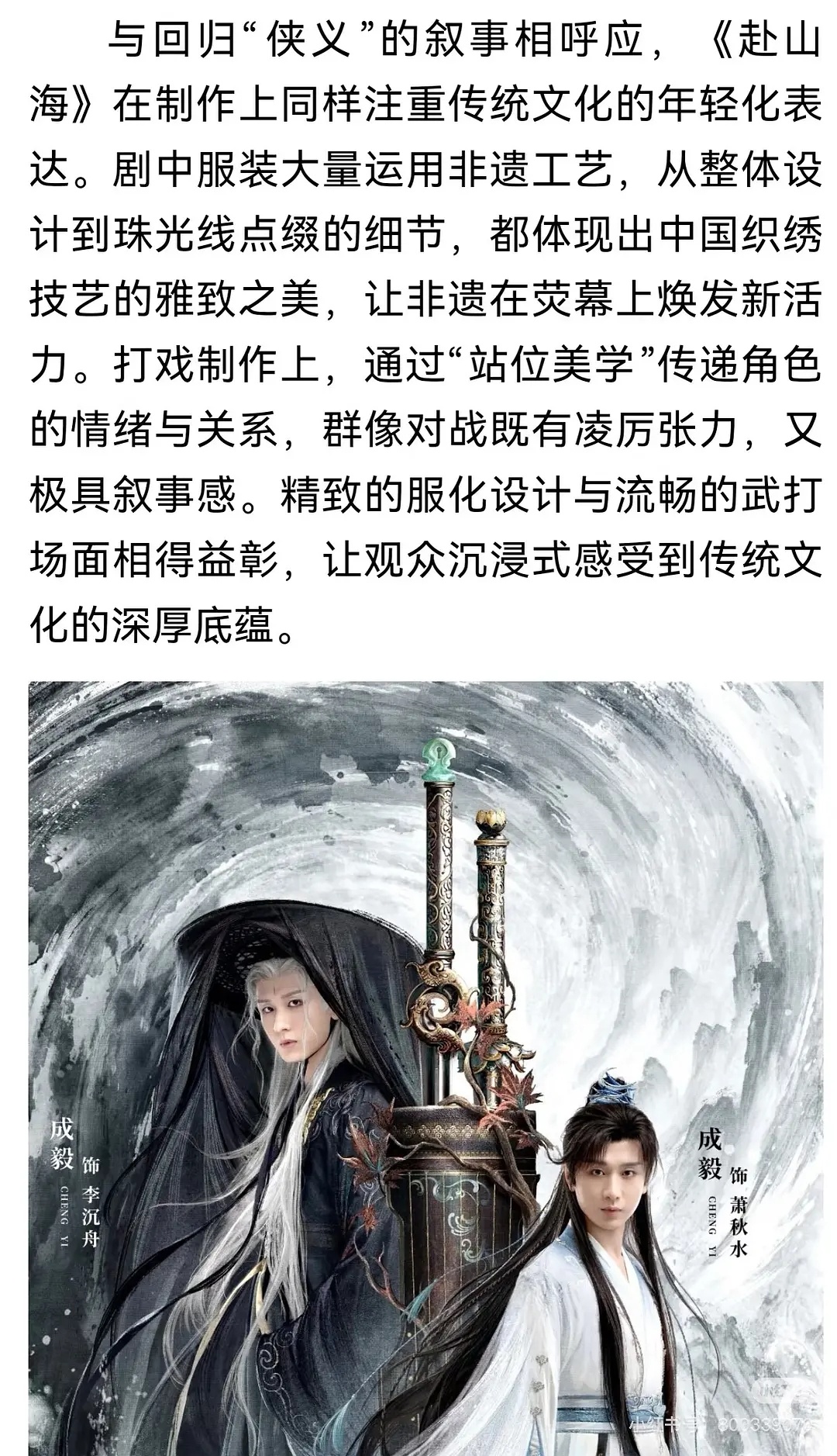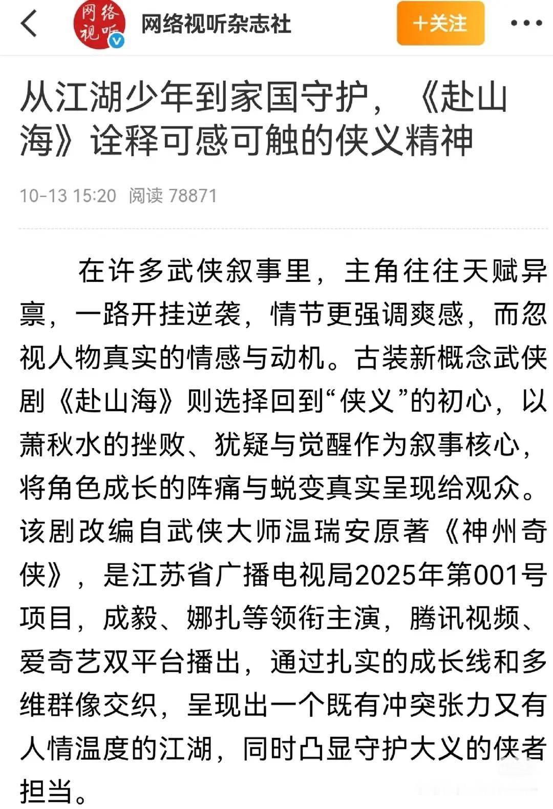 网络视听杂志社是国家广播电视总局主管、中国广播影视出版社主办的官方机构,夸成毅赴山海优秀,还特地夸了服化道[送花花] ​​​