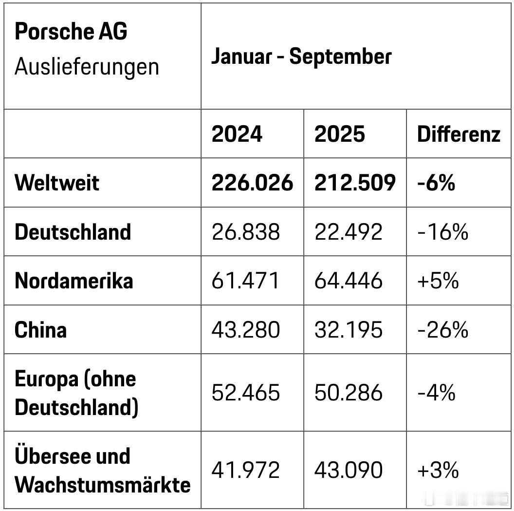 懂车之道讯 懂车之道快讯,保时捷汽车发布最新数据显示,2025年前三季度全球市场销量为212509辆,同比下降6%,其中德国和中国市场出现大幅下滑。具体到细分市场,保时捷在德国本土市场销量同比下滑16%至22492辆,在欧洲(德国除外)市场同比下滑4%至50286辆,在海外和新兴市场同比增长3%至43090辆。从销量规模来看,保时捷最大单一市场是北美洲,同比增长5%至64446辆,中国市场,销量再次出现大幅下滑,仅32195辆,相较于2024年同期的43280辆下滑26%,占全球总销量的15%。