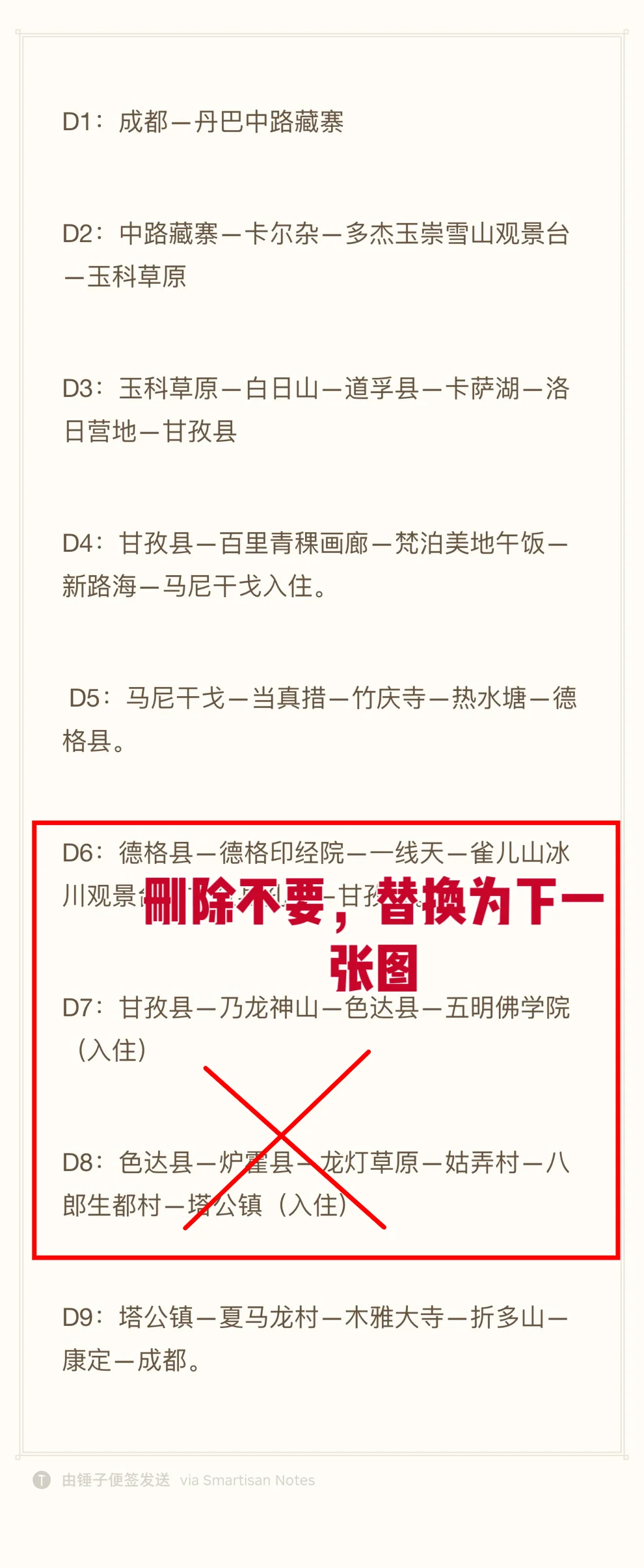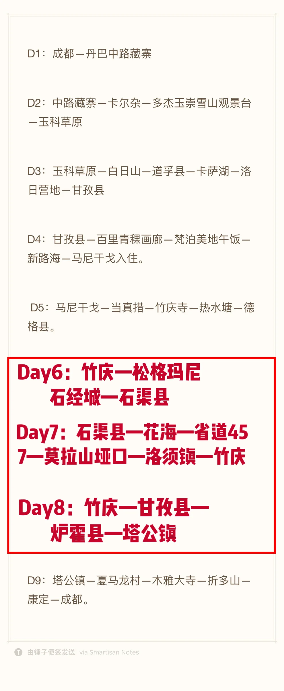 5,以付费攻略的路线为主体框架,如果想加入石渠,day5到了竹庆后,就不建议去【德格】了,而是住在竹庆。day6上午直接从竹庆导航【松格玛尼石经城】,3个半小时车程