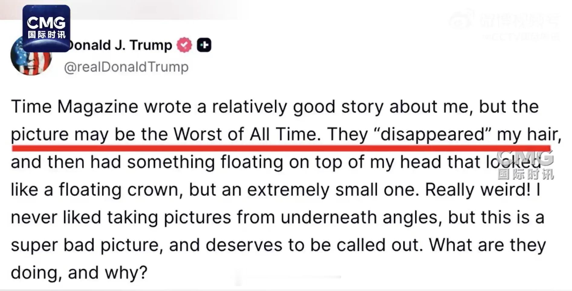 特朗普抱怨《时代》周刊封面图:选了可能是史上最差的一张照片,他们“抹去了”我的头发。
