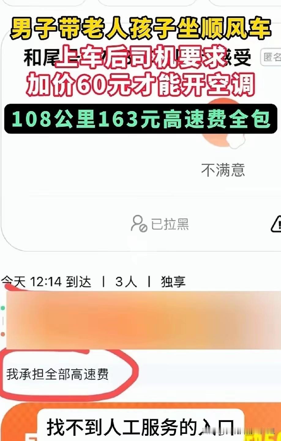湖南,男子带一家老小打顺风车,108公里163块钱包高速费。途中因车内闷热,残疾的高龄奶奶,和年幼的孩子受不了,男子让司机开空调,司机要求加60块钱。男子认为,双方沟通时,司机并没提加价的事,司机也很犟,不加钱,就不开空调,还把车窗锁死。男子打客服电话投诉,客服电话竟是个摆设,永远打不通。男子气的将视频发布到网上,没想到,结果却适得其反。 视频发上网,评论区却翻了车。不少人算起经济账,觉得108公里才163块,刨去油费、车辆损耗和平台抽成,司机确实赚得少,开空调增加的成本谁承担? 甚至有声音说,顺风车不是专车,不能既要极致低价,又要求五星服务。可这些账,算不清高温下残疾老人和孩子所承受的真实煎熬。这趟旅程的核心矛盾早已超越了几块钱的电费,直指顺风车这种出行方式的模糊地带:它到底是“共享互助”还是变相的“低价营运”?司机觉得委屈,乘客感到愤怒,这种认知错位成了无数纠纷的温床。 平台在这场争执中神奇“隐身”了。客服电话打不通,绝非个例。等到事情闹大,平台往往才会介入,对违规司机进行处罚,甚至永久封禁账号。但这种事后处理,并不能弥补过程中的监管缺失。从法律角度看,司机在行程中单方面要求加价,甚至因未达目的而锁闭车窗,不仅违约,还可能侵犯了乘客的公平交易权,甚至涉及限制乘客人身自由的风险。有法院明确判决,网约车平台作为服务的组织者和监管者,需要对司机行为负责,未尽到安全保障义务时需承担相应责任。 为什么司机总想“额外创收”?背后是行业饱和下的利润摊薄。油价、平台抽成、车辆损耗,压得司机喘不过气。但这不是把成本转嫁给乘客的正当理由。有专家指出,解决问题的根本在于平台要建立更透明、合理的定价和费用分担机制。比如高速费、空调费等额外费用,完全可以在下单前就明确提示,让乘客自主选择,而不是等上车后变成“强制消费”。 乘客的维权意识正在觉醒。像三亚、重庆等地,对于司机诱导取消订单、线下加价的行为,交通执法部门会开出罚单。遇到类似情况,最好的做法是保留所有证据:订单信息、聊天记录、录音录像,下车后第一时间向平台和交通运输监管部门投诉。必要时候,像案例中那样,通过法律途径维权,哪怕只索赔1元,也具有重要的象征意义。 这件事最让人无奈的,是它几乎成了一个无解的死结。司机觉得不赚钱,乘客体验糟糕,平台看似居中调停实则规则模糊。共享经济的善意,在现实成本与利益的挤压下变了形。或许,我们需要思考的是,如何让规则更清晰,让监督更有效,让沟通更顺畅,而不是让本该便利的出行,变成一场又一场的“高温煎熬”。 各位读者你们怎么看?欢迎在评论区讨论。