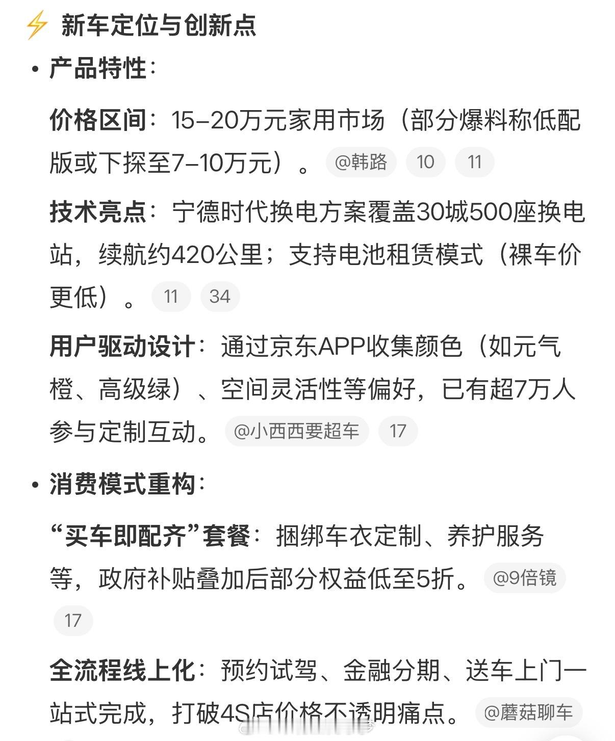 京东入局造车 京东这次入局造车,玩的是“资源拼图”新思路。不碰生产线,而是拉上广汽搞制造、宁德时代供电池,自己专注用户洞察和渠道服务,倒像是给汽车行业开了个“生态协作”样板间。从用户需求反向定制车型,连车衣颜色都能选,这种“参与感”确实戳中年轻人。不过,10万级市场早就是红海,比亚迪、埃安们早已扎堆,京东能否靠“买车+养车+换电”套餐杀出重围?毕竟造车不是拼流量,交付能力和品控才是真考验。但换个角度看,互联网基因倒可能让汽车服务更轻量化——试驾预约、售后维保一键搞定,或许真能撕开传统4S店模式的老口子。这场跨界实验,至少让消费者多了个“国民级”选项,至于能否成为爆款,11月见分晓。大v聊车