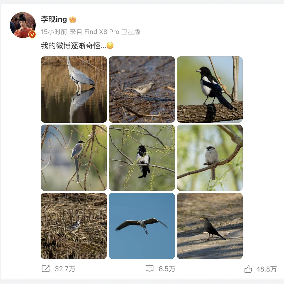 狂喜啊,李现在拍鸟的路上一去不返,这次又被发现跑去了奥森。李现也非常自觉地发微博说,自己的微博画风逐渐奇怪[笑哭R]让我们再来赏析一下现大爷的新一批作品。