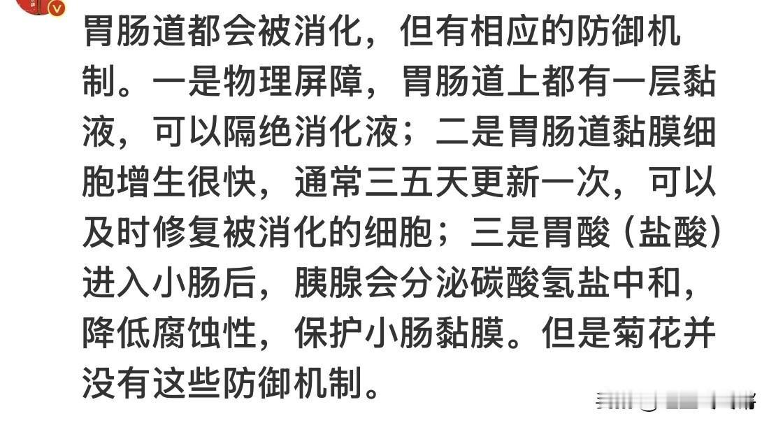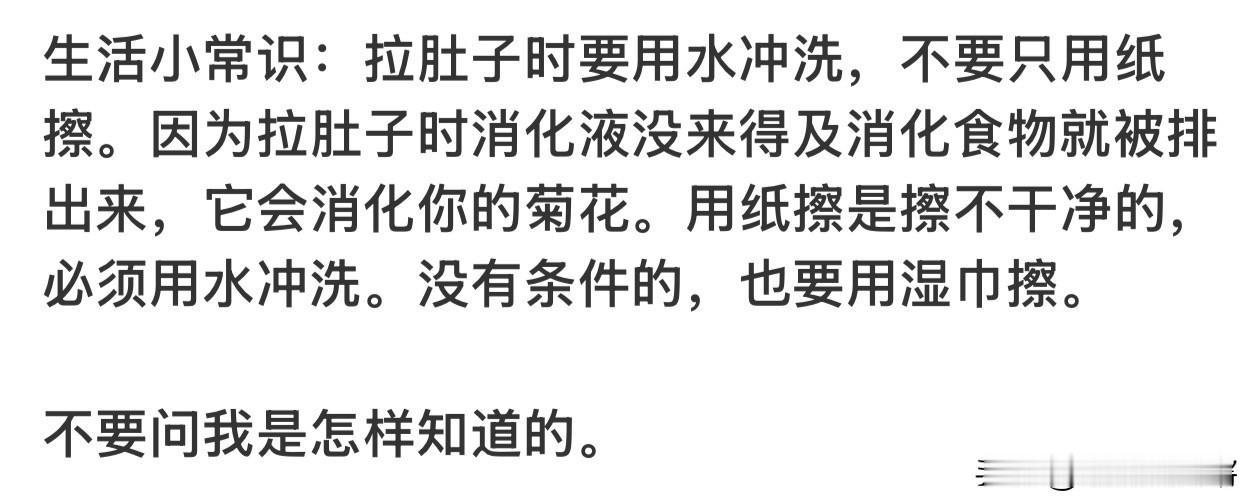 有博主说:拉肚子时要用水冲洗,不要只用纸擦。因为拉肚子时消化液没来得及消化食物就被排出来,它会消化你的菊花。用纸擦是擦不干净的,必须用水冲洗。没有条件的,也要用湿巾擦。 网友们不理解,博主亲自下次解释:@李鲆:胃肠道都会被消化,但有相应的防御机制。一是物理屏障,胃肠道上都有一层黏液,可以隔绝消化液;二是胃肠道黏膜细胞增生很快,通常三五天更新一次,可以及时修复被消化的细胞;三是胃酸(盐酸)进入小肠后,胰腺会分泌碳酸氢盐中和,降低腐蚀性,保护小肠黏膜。但是菊花并没有这些防御机制。 奇奇怪怪的知识增加了,难怪我每次拉稀,菊花都会火辣辣,擦到纸都破了还觉得没干净,隔天菊花又红又疼,还以为是自己太用力,原来竟是 “消化液在搞事情”!次再遇到这种情况,终于不用再硬扛着疼瞎擦了