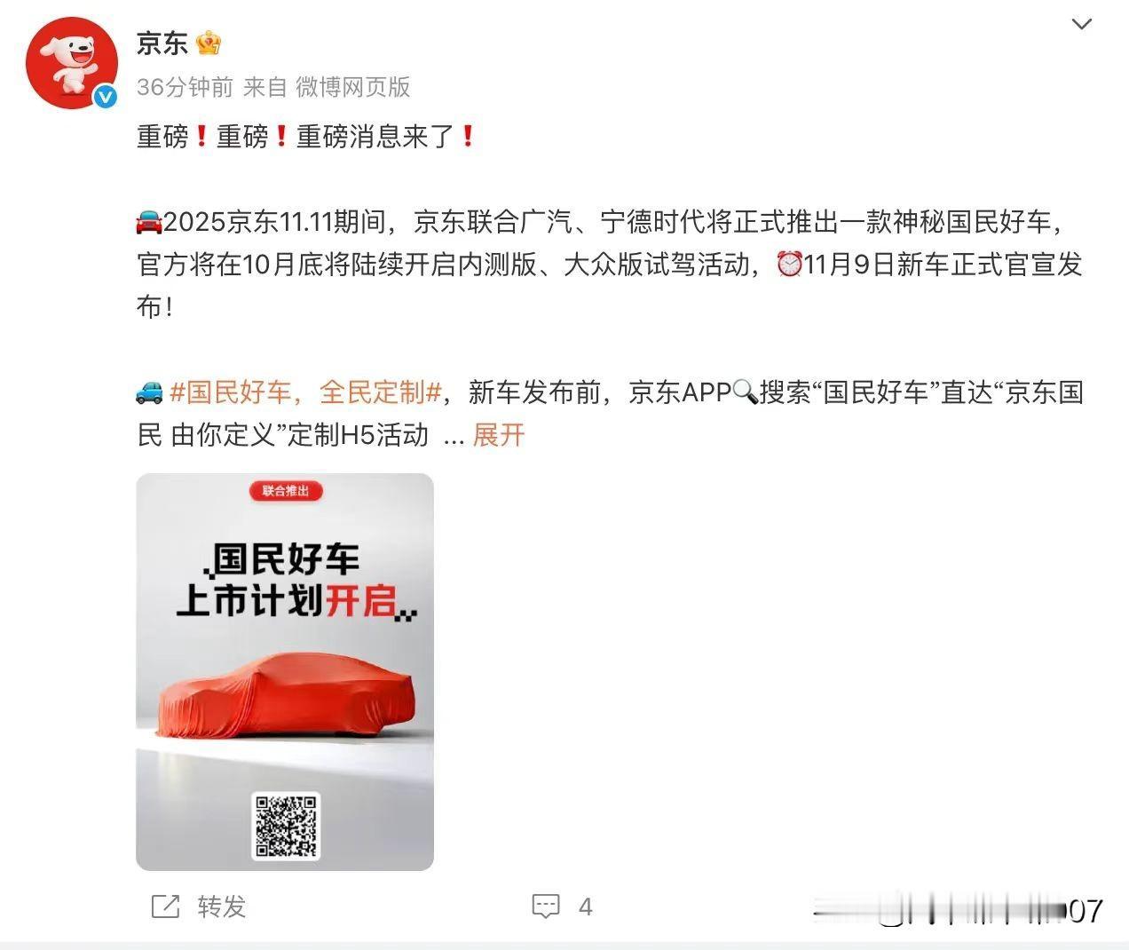 重磅消息:京东也要进军汽车行业啦! 就在刚才,京东宣布,将携手广汽与宁德时代推出一款国民好车,代号H5。将于10月底开启内测,11月9日正式对外发布。