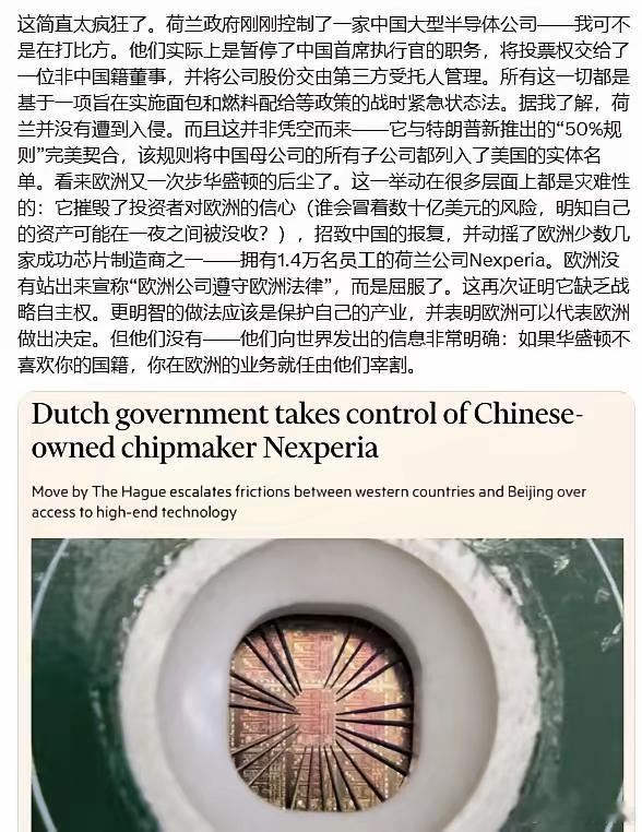 荷兰政府刚刚控制了一家中国大型半导体公司,他们实际上是暂停了中国首席执行官的职务,将投票权交给了一位非中国籍董事,并将公司股份交由第三方受托人管理。所有这一切都是基于一项旨在实施面包和燃料配给等政策的战时紧急状态法。