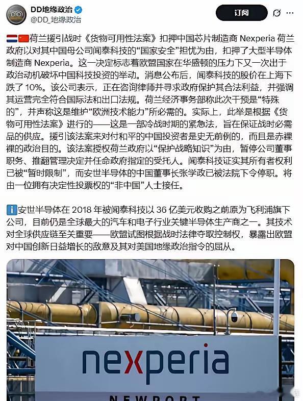 荷兰援引战时《货物可用性法案》扣押中国芯片制造商 Nexperia 荷兰政府以对其中国母公司闻泰科技的“国家安全”担忧为由,扣押了大型半导体制造商 Nexperia。