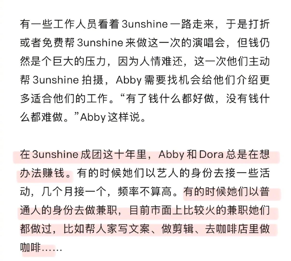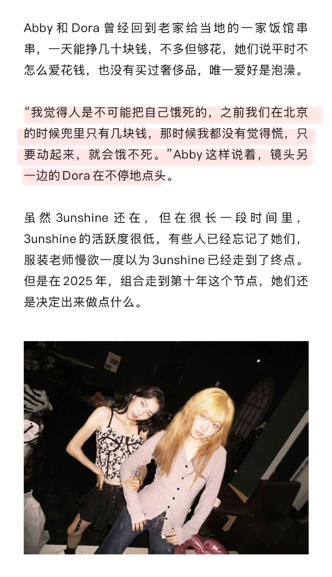 3unshine回应解散危机 3unshine说组合缺一首大爆曲 贴吧求歌词、校门口拍宣传照、攒钱录歌却遭骗、打零工支撑组合发展……3unshine以近乎“野蛮生长”的方式走过这十年。如今十周年演唱会在即,3unshine称她们是在废墟上种花,“没有定数”是她们的核心竞争力。