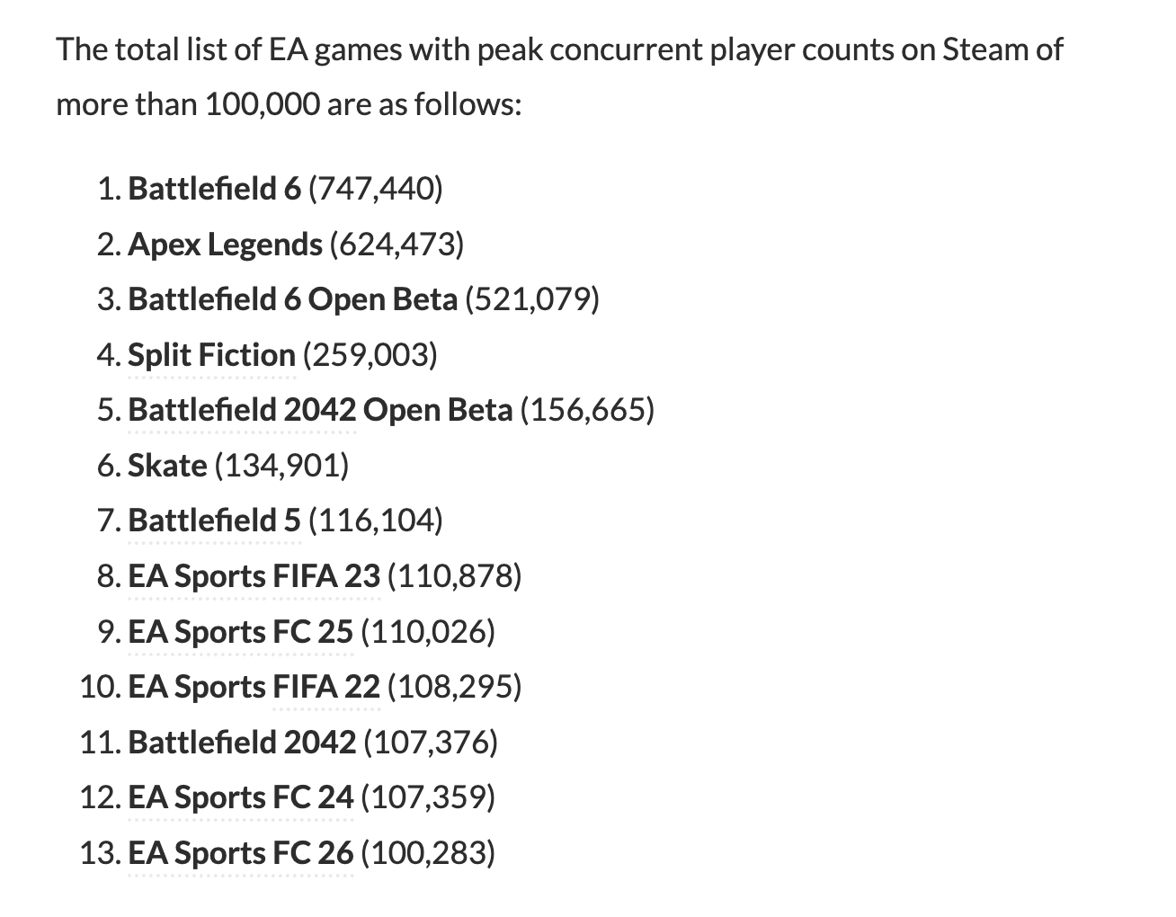 以下是Steam在线峰值超10万的EA游戏: