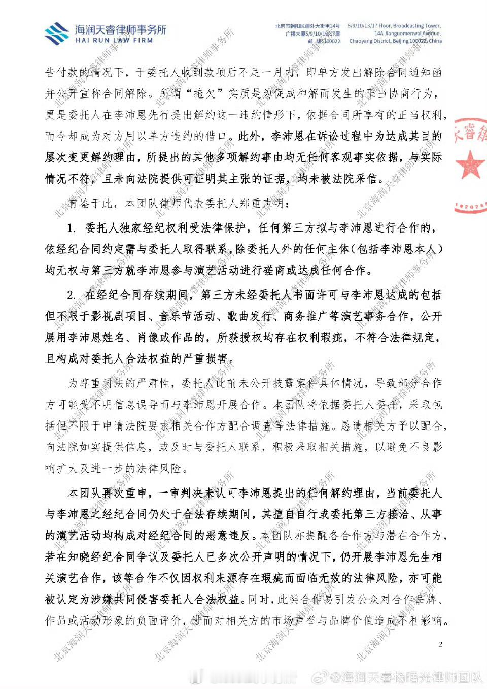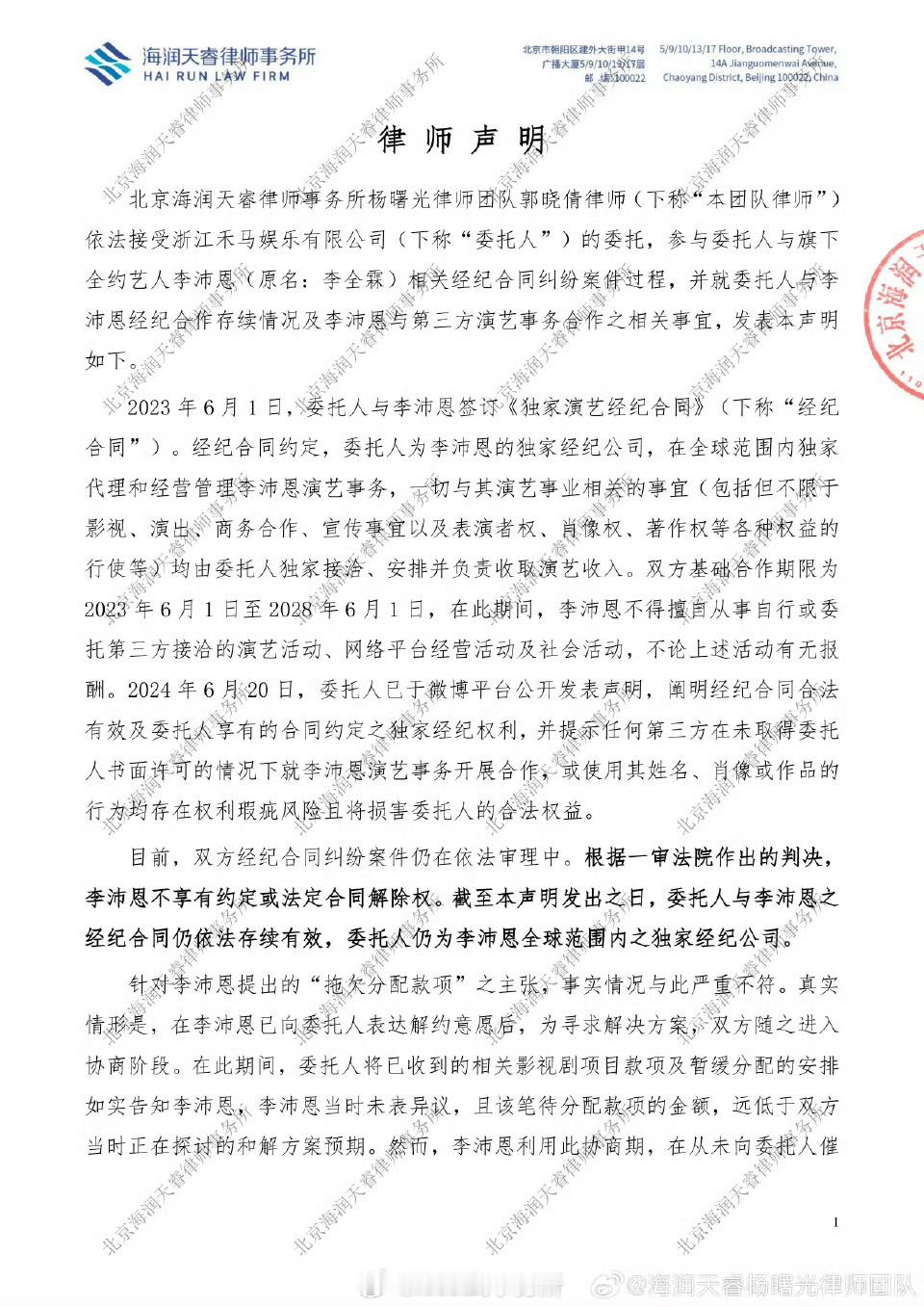 禾马娱乐发布声明,称李沛恩经纪合同仍有效,好像说他单方违约,还艾特了品牌方娇兰[