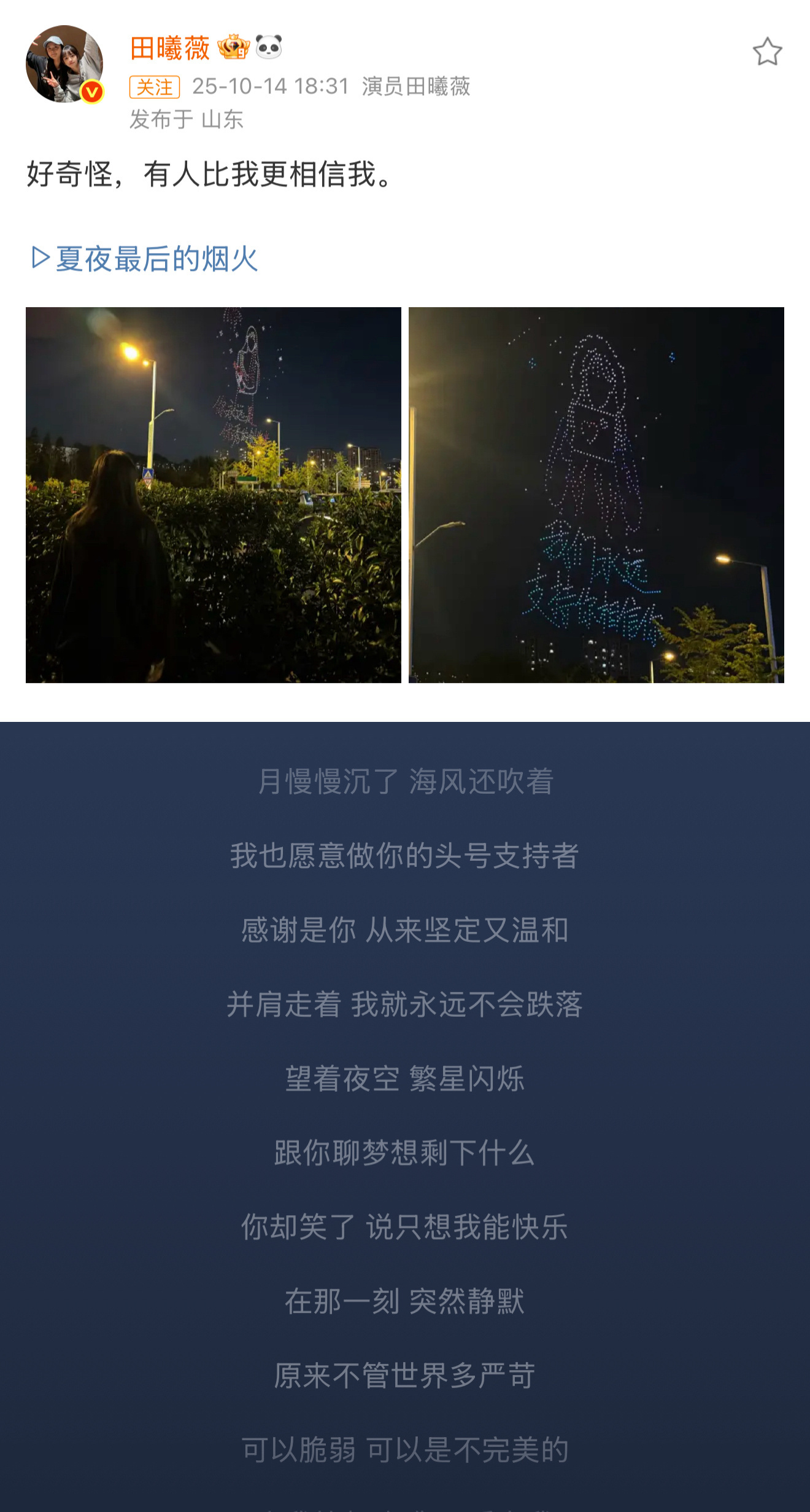 田曦薇 好奇怪有人比我更相信我田曦薇 在生日之际被粉丝无人机应援打动,一句“好奇怪,有人比我更相信我”引发广泛共鸣。从作品支持到公益同行,从精神鼓舞到信念共筑——这场偶像与粉丝之间的情感联结,展现了当代青年文化中真诚、温暖、积极的新型关系。信任,成为彼此成长路上最坚实的力量。