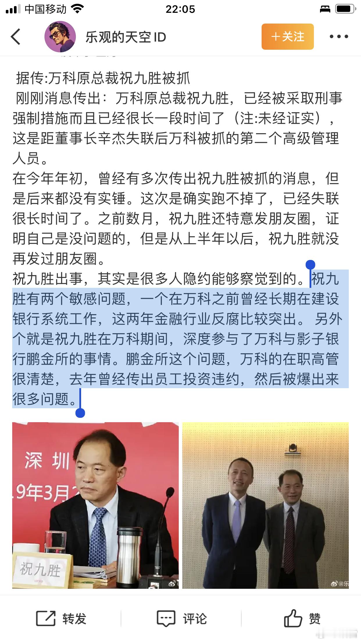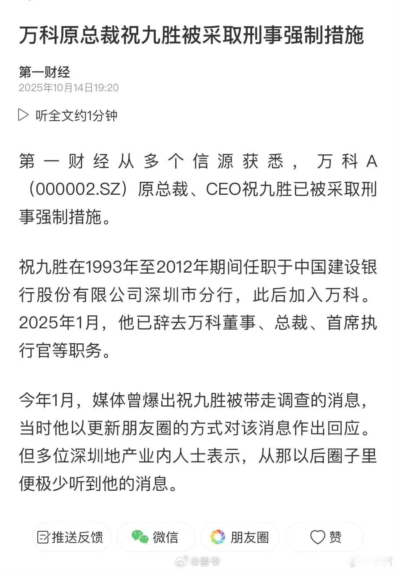 深铁集团已累计向万科借款超250亿元…上任不到9个月,辛杰辞去万科董事长职务,深铁系黄力平接任;与辛杰案相比,万科原总裁、CEO祝九胜案才是要害,这是实打实万科跑不了。