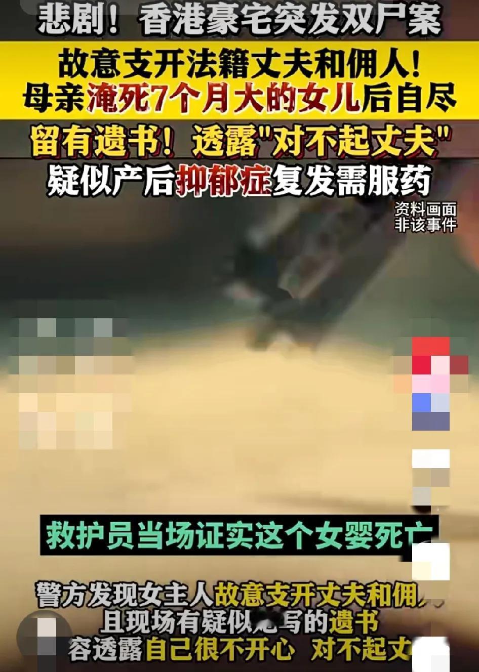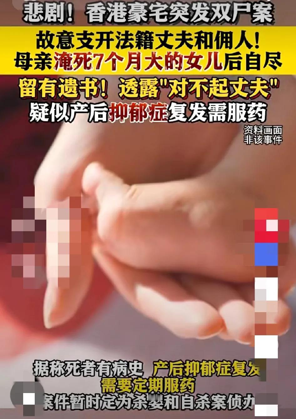 香港一豪宅发生双尸人伦惨案,女子支开佣人和丈夫先溺毙7个月大女婴再吊颈 太惨了!惨绝人寰呐!电影都不敢这么拍,女子亲手杀死女儿,然后上吊身亡,阴郁症害死人呐!好端端的一个家就没了,你让这家丈夫情何以堪呀,怎么活呀! 据报道,2025年10月13日,在香港寿山村豪宅区,一名母亲因产后抑郁症复发,在支开佣人和丈夫后,溺毙7个月大的女儿并自尽,现场发现遗书表达对丈夫的歉意。 再有,法籍丈夫报警称妻子上吊、女儿昏迷;警方到场确认母女身亡,无其他明显外伤;母亲死于缢吊,女婴死于溺水,死因待最终解剖确认。 另外,遗书透露母亲因不开心而自杀,并称“对不起丈夫”;死者有产后抑郁症病史,需定期服药;案件暂定为杀婴和自杀案。 最后,产后抑郁症复发是悲剧主因,凸显心理健康支持不足;类似事件提醒社会关注产后抑郁筛查与干预机制。