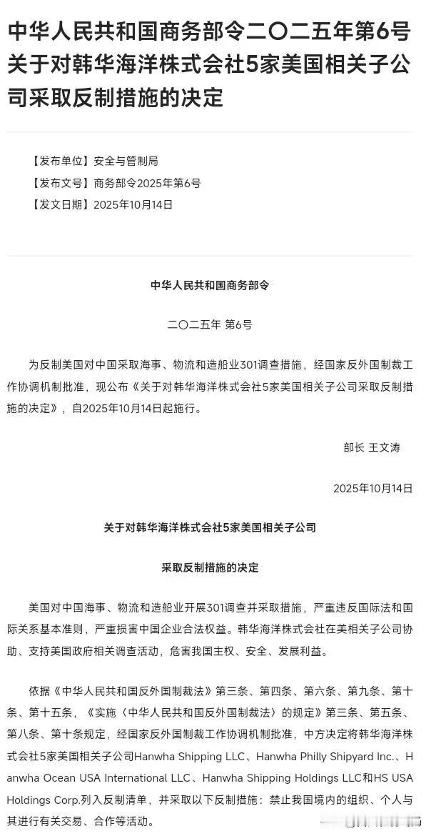 中美贸易战,韩企掏出215万亿“援美”,被商务部直接拉黑! 10月14日,商务部一纸公告,给风头正劲的韩华海洋泼了盆冷水。公告措辞干脆利落:禁止中方公司和个人与韩华海洋5家美国子公司开展任何交易合作。这意味着,这家韩国造船巨头的美国业务,被中方彻底“拉黑”了。 谁也没料到,曾靠中方市场缓过一口气的韩华,会栽在自己的“押注”上。韩华海洋的前身是大名鼎鼎的大宇造船,巅峰时曾是全球液化天然气船制造的“领头羊”。 可随着中方造船厂异军突起,大宇造船招架不住竞争,最终资不抵债,被韩华集团收入麾下。按理说,借中方造船业崛起的东风,韩华本该懂得“唇齿相依”的道理,可它偏偏在中美贸易战的漩涡里,选了最冒险的一条路。 导火索早有铺垫,美方盯上中方造船业后,韩国船企就表现得异常活跃。今年8月,韩国船企联合抛出一个“让美国造船业再次伟大”的项目,宣布砸下1500亿美元(约215万亿韩元),帮美国建船厂、培人才。这波“援美”操作里,韩华堪称最积极的“急先锋”。 它掏出1亿美元(约1430亿韩元),把美国最大的船厂全盘买下,砸钱翻新基础设施,从韩国本土调派资深工人和工程师,手把手给美国工人传授造船的核心技艺——小到焊接工艺的细节,大到总段建造的经验,恨不得把吃饭的本事都教出去。 更让人警惕的是,韩华不止盯着商船市场,还把爪子伸向了军工领域,已经接下至少3艘美军大型补给舰的大修订单,摆明了要扎根北美、站队美国。 更过分的是,韩华还直接帮美对中方造船业发起301调查,提供了不少所谓“证据”。 商务部的公告说得明白,正是这种行为,反制措施不过是维护自身利益的必然之举。韩华以为抱上美国大腿就能高枕无忧,却忘了自己的造船生意,压根离不开中方的供应链。 现代造船业早就不是“单打独斗”的行业,大型龙门吊、超大型浮船坞这些“重器”,是造船的刚需。而在这些领域,中方早就掌握了绝对话语权。全球80%以上的新装港机来自中国振华重工,美国造船厂用的龙门吊,不少都印着“ZPMC”的标志。 当年奥巴马在迈阿密港口喊“振兴美国制造”,风吹落国旗,露出的正是中方吊机的商标,成了国际笑谈。就连美军科幻战舰DDG-1000下水时,用的浮动船台都是“中方制造”。韩华想在美国建船厂、造军舰,能离得开这些设备?答案显然是否定的。 没有中方的龙门吊,超万吨的船体分段根本没法吊装;没有中方的浮船坞,军舰维修都得卡脖子。如今中方一纸禁令,等于掐断了韩华的设备补给线。找替代?难如登天。 欧洲的龙门吊不仅价格贵出三成以上,交货周期还得等半年,美国自己的吊机最大起重量才1050吨,跟中方1600吨级的差距一目了然。这一下,韩华砸在美船厂的投资,恐怕要变成“沉没成本”。 有人或许会问,韩华就不怕吗?说到底,还是贪心和误判在作祟。看到美国打压中方了造船业,韩国船企以为能坐收渔利,《韩国时报》之前就报道,拜登政府对中方造船企业施压后,韩国五大造船股直接大涨。 韩华更是想趁机抢占市场,一边靠美国订单赚快钱,一边借美国技术壁垒挤走中方同行。可它忘了,中方不只是造船大国,更是造船产业链的“中枢”——从钢材到设备,从零部件到配套服务,中方的供应链成熟度全球无出其右。 这种误判,本质上是没看清中美贸易战的本质。美国想靠打压中方产业维持霸权,却早已失去了完整的制造业体系;韩国船企想“站队取巧”,却踩在了中方的红线之上。中方的反制从来不是“意气用事”,而是精准打击,你在我核心利益上动刀,我就在你产业链命脉上施压。 韩华不是第一个,也绝不会是最后一个为“政治押注”付出代价的企业。更讽刺的是,韩华的前身大宇造船,当年就是因为竞争不过中方船厂才濒临破产。中方造船业从追赶到超越,靠的不是“打压别人”,而是实打实的技术突破和成本控制。 如今我们能造全球最先进的LNG船,能实现“一年下水一支舰队”,靠的是全产业链的硬实力。韩华以为抱上美国大腿就能逆转局势,简直是异想天开。 美国造船业的衰落,根源是本土制造业的空心化,靠外来投资和技术输入根本填不上窟窿,看看美国船厂常年拖欠工资、技术工人流失的现状就知道,“再次伟大”不过是句口号。 韩华的教训,给所有跨国企业提了个醒:在中美博弈的棋盘上,“选边站”从来都是高风险游戏。产业链的紧密联系,早已让各国“一荣俱荣,一损俱损”,想靠依附强权、打压对手获利,最终只会反噬自身。 反制措施,是维护自身利益的警告。我们欢迎公平竞争,但绝不接受背后捅刀。如今,韩华的美国子公司被拉黑,股价已经出现异动。尊重规则、平等合作,才是长久之道。否则,下一个被“拉黑”的,可能就是自己。