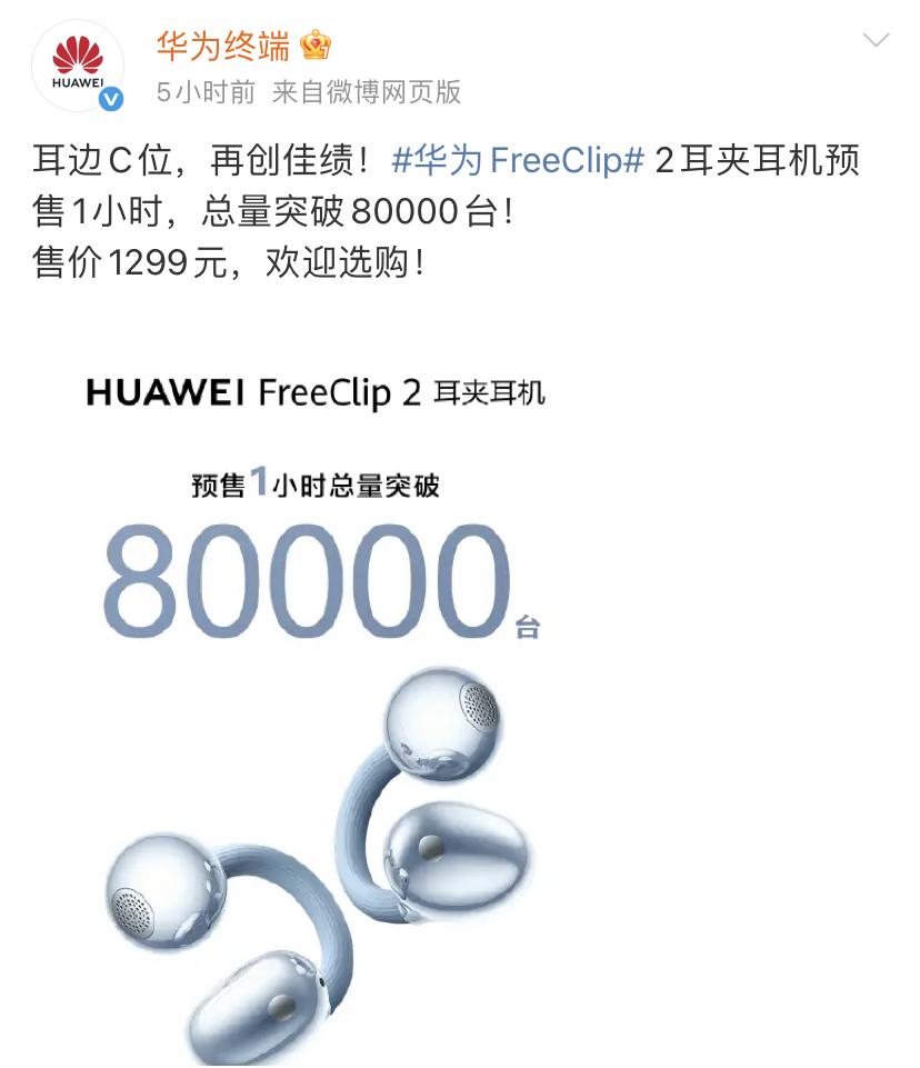 果然卖爆了,华为2代耳夹耳机预售1小时卖了80000多台,这销量真牛逼。别忘了,这可是售价1299的耳机,感觉除了苹果的AirPods,业内没有这么爆的耳机了。有网友直呼,华为一定保护好自己的知识产权,别让小偷给偷走了。