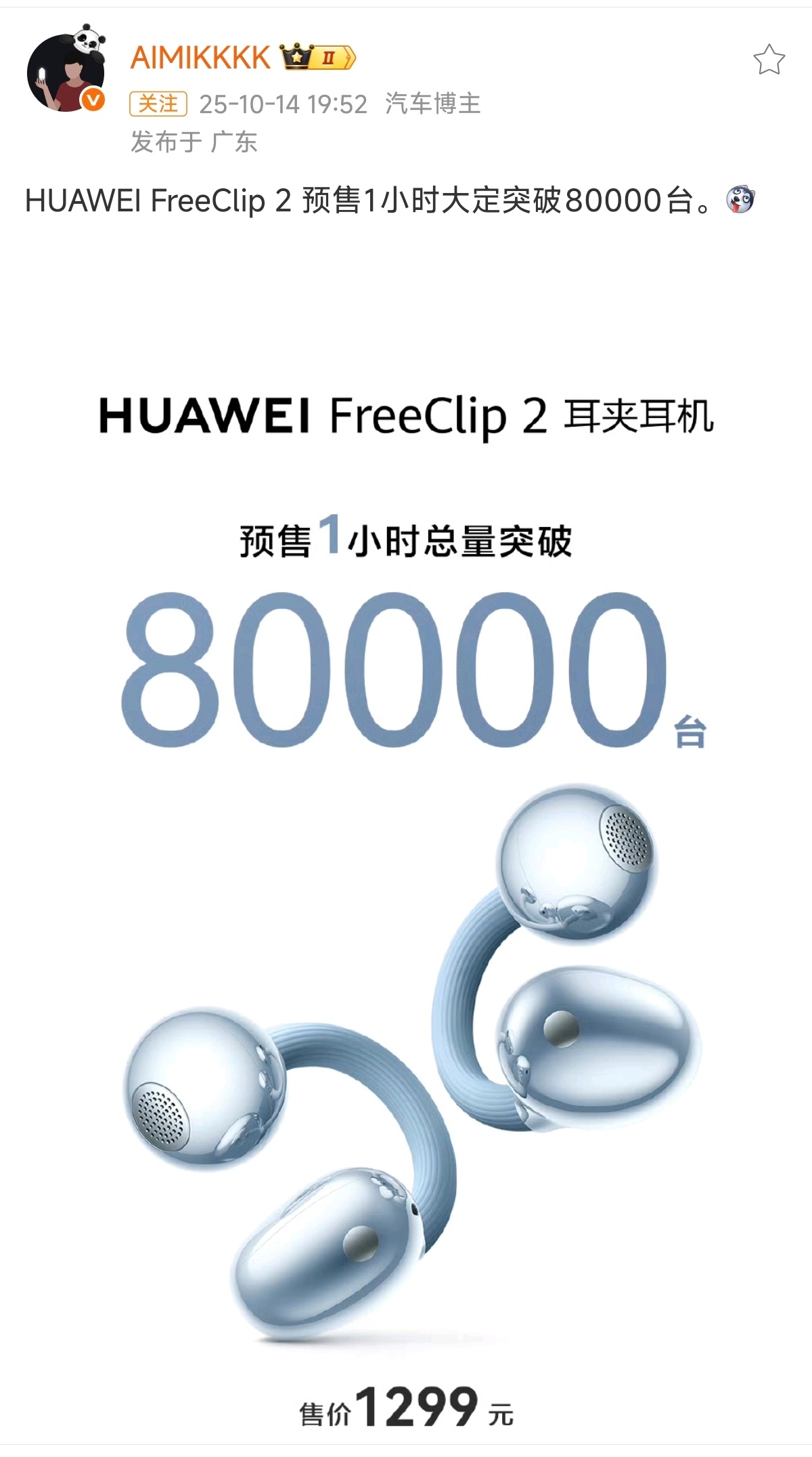 华为FreeClip 2,1小时大定突破80000台,恭喜!