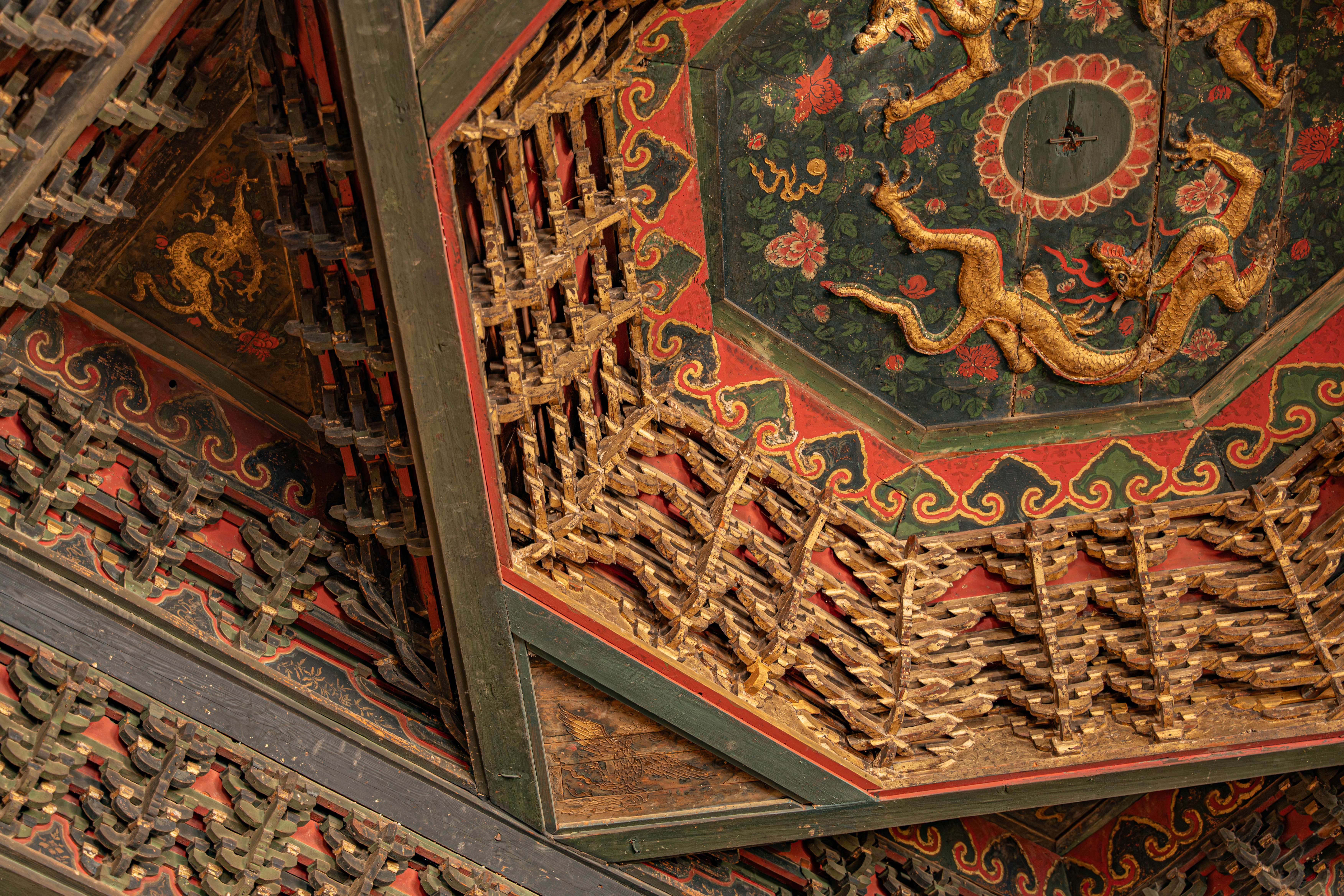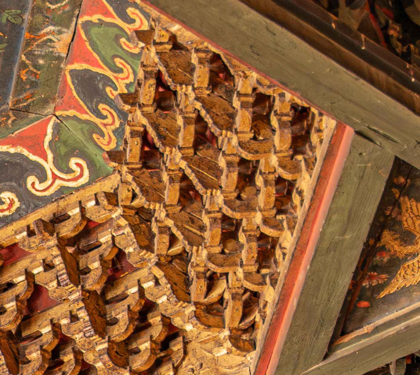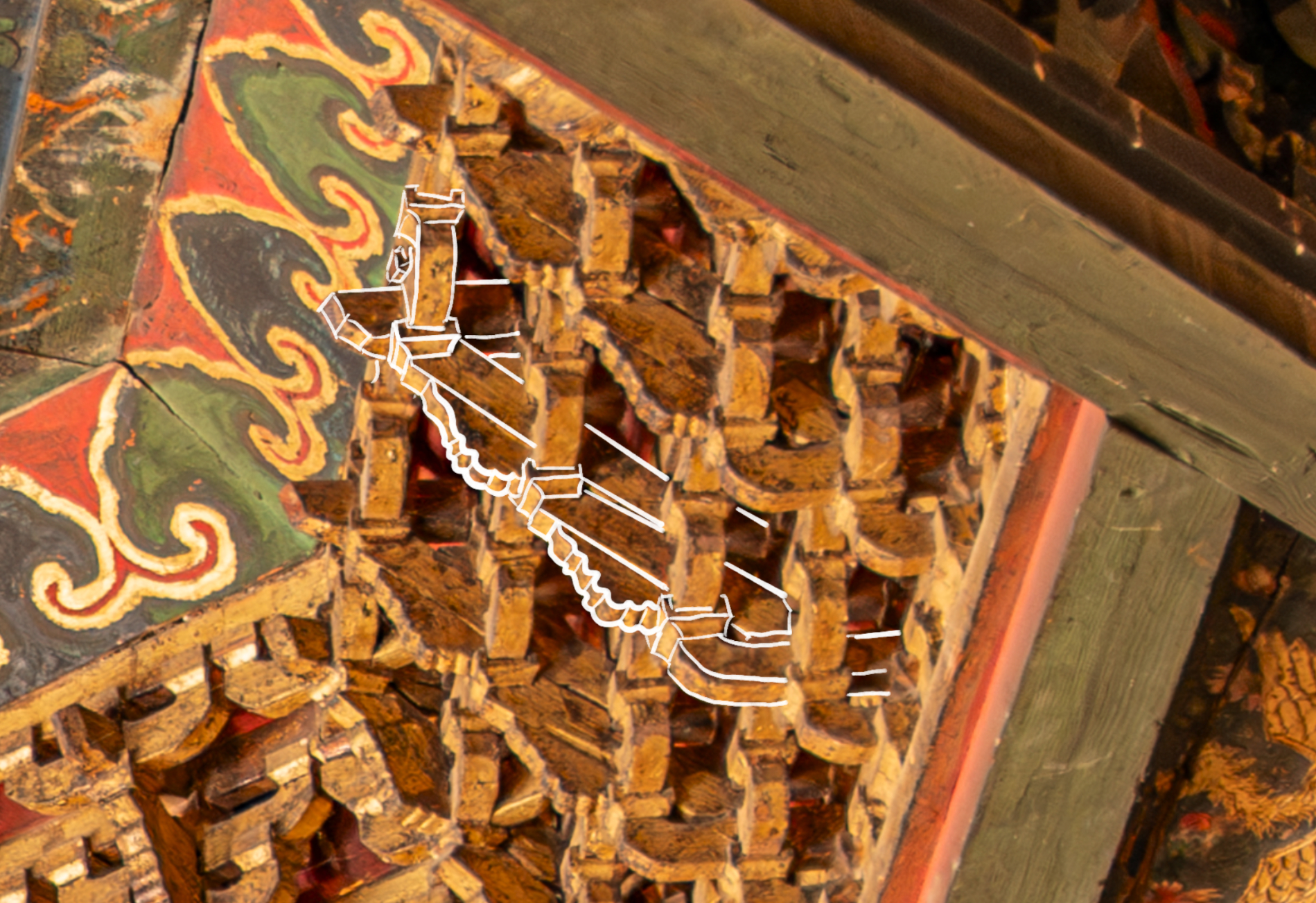 净土寺大殿小木作藻井罕见地保存了两组真实的上昂结构,而非北方元以后的刻线。