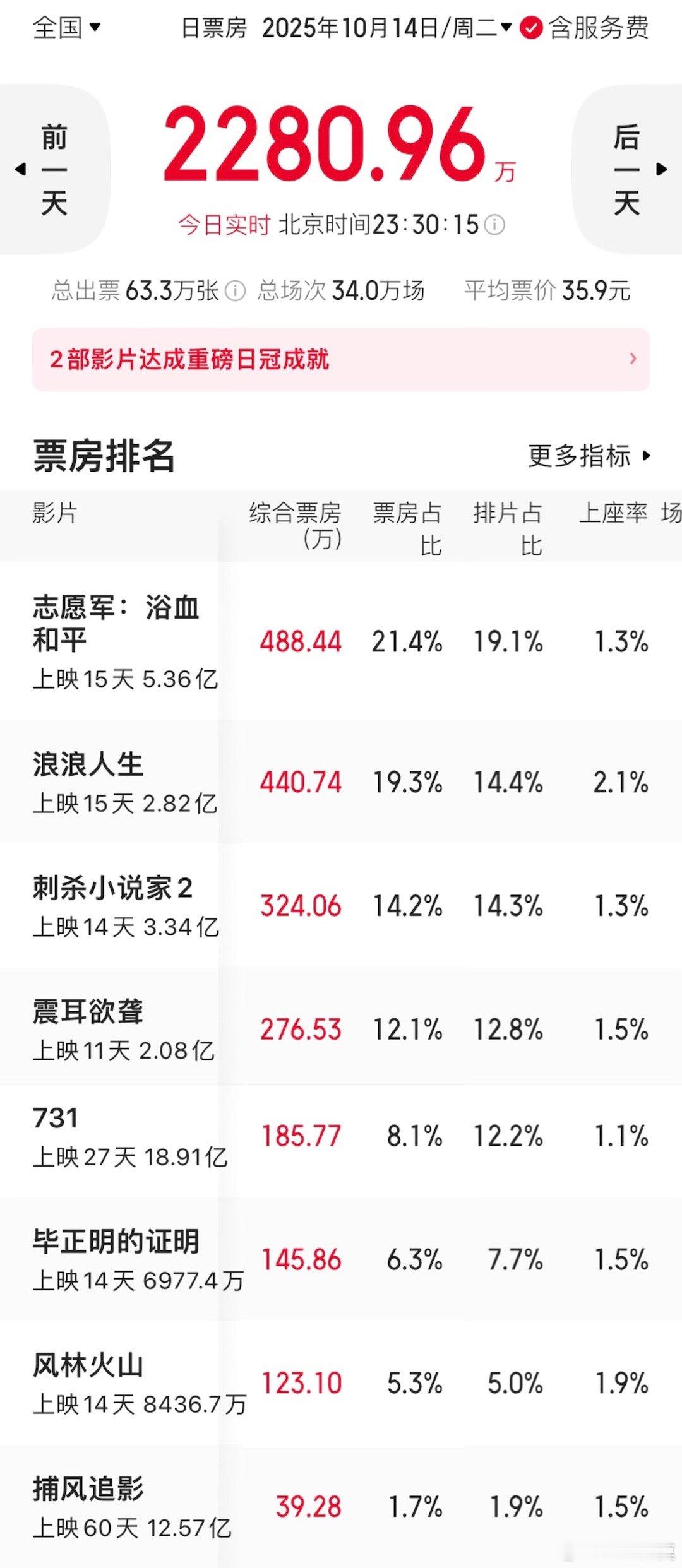 大盘好惨,才2200多万。上座率普遍低,只有《浪浪人生》的上座率过了2%。但也只有2.1%。看电影的兴趣都跑哪儿去了?