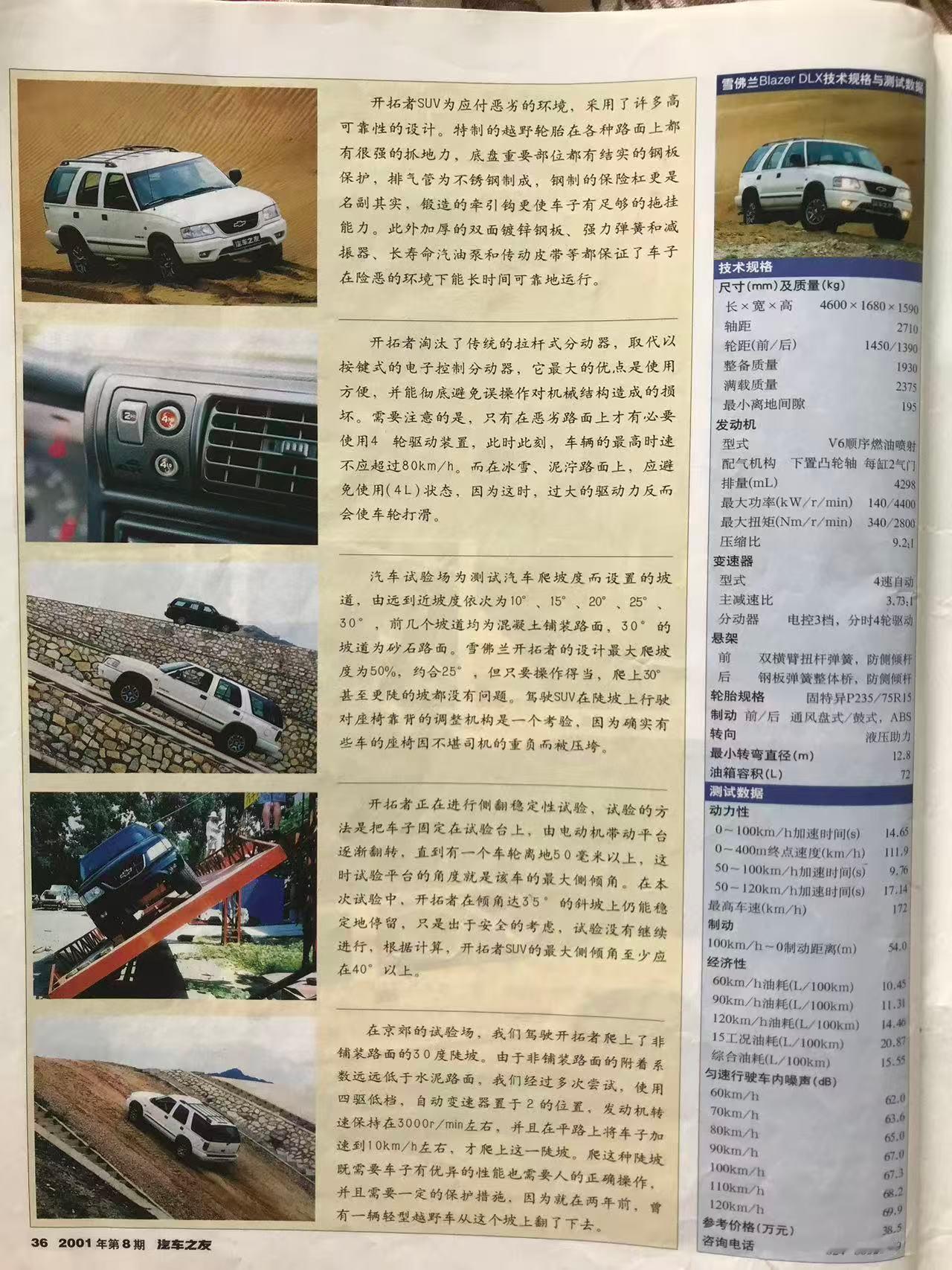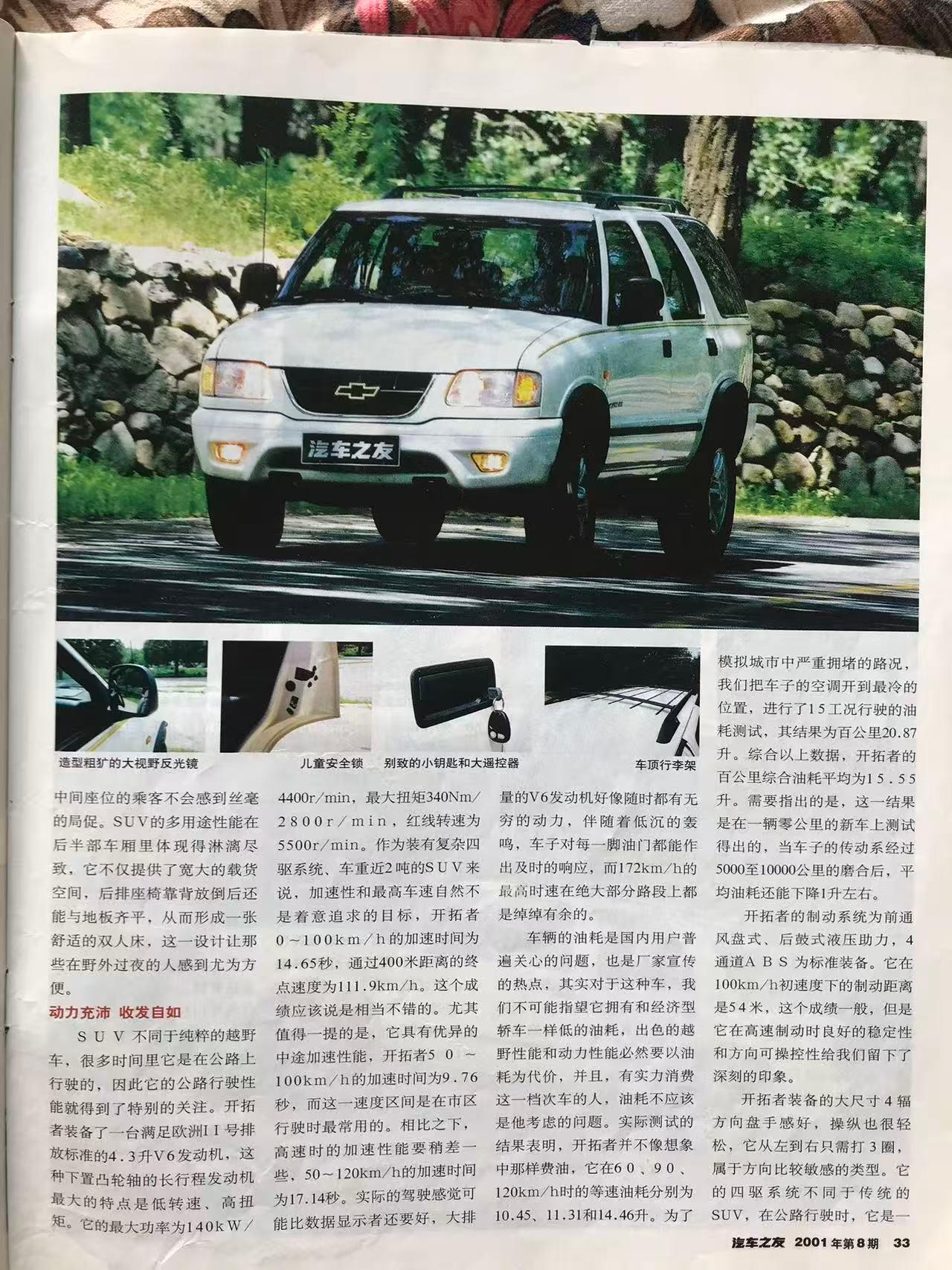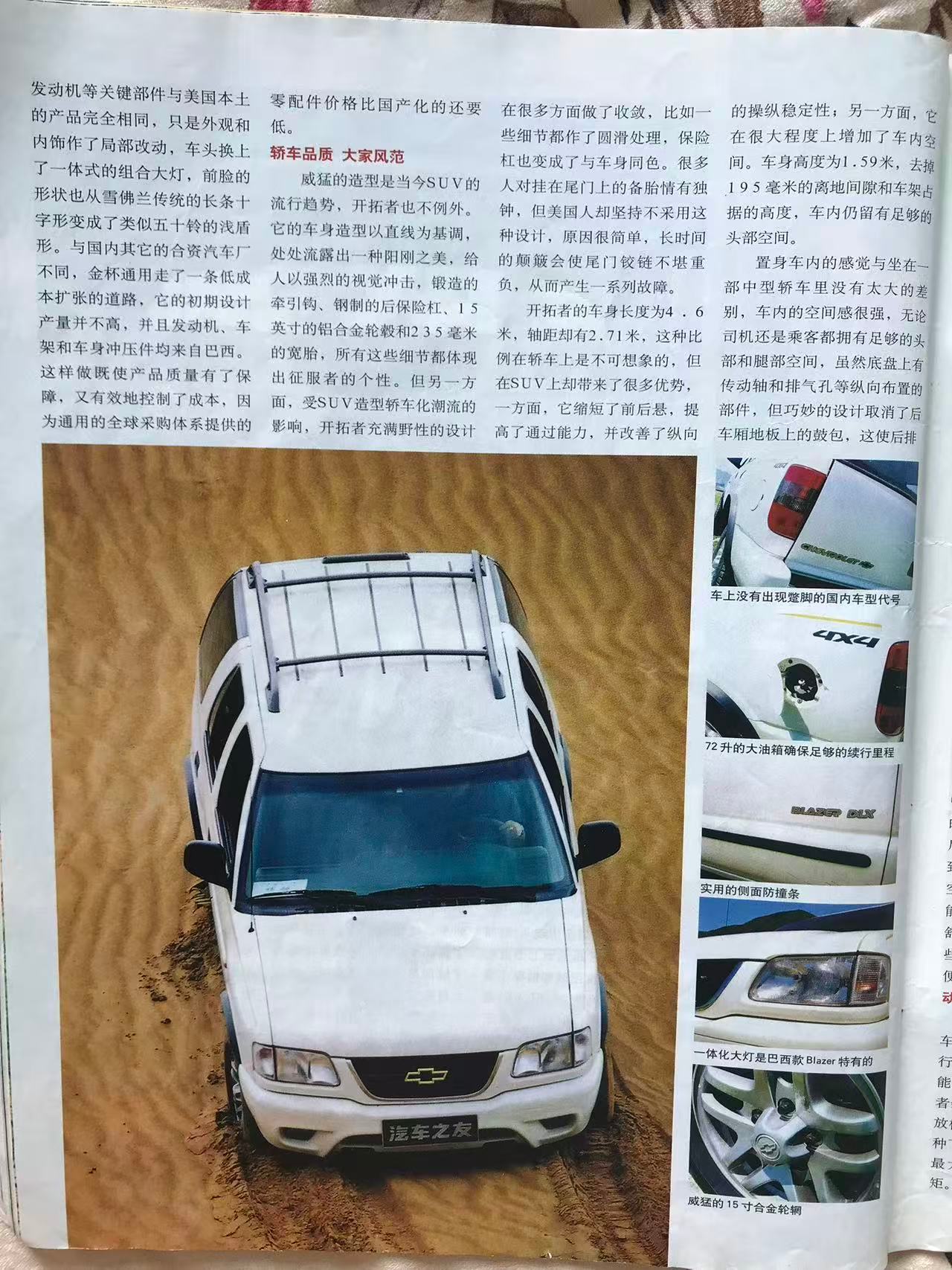 金杯通用雪佛兰开拓者于2001年上半年上市,虽然同时期在北美市场也有开拓者车型,但国产雪佛兰开拓者是基于1995年诞生的巴西版开拓者打造。由于和当时五十铃的关系,巴西版的开拓者外观造型和五十铃非常接近,后来的国产陆风汽车看上去也是类似造型[doge]。以今天的眼光看,这款开拓者尺寸很紧凑,三维仅为4600mm✖️1680mm✖️1590mm,尤其高度以当时SUV的标准看很低。虽然尺寸小,但作为非承载式车身,开拓者还是有接近2吨的车重。