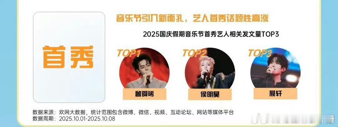 国庆音乐节首秀相关发文量Top3曾舜晞侯明昊展轩!你为谁心动?