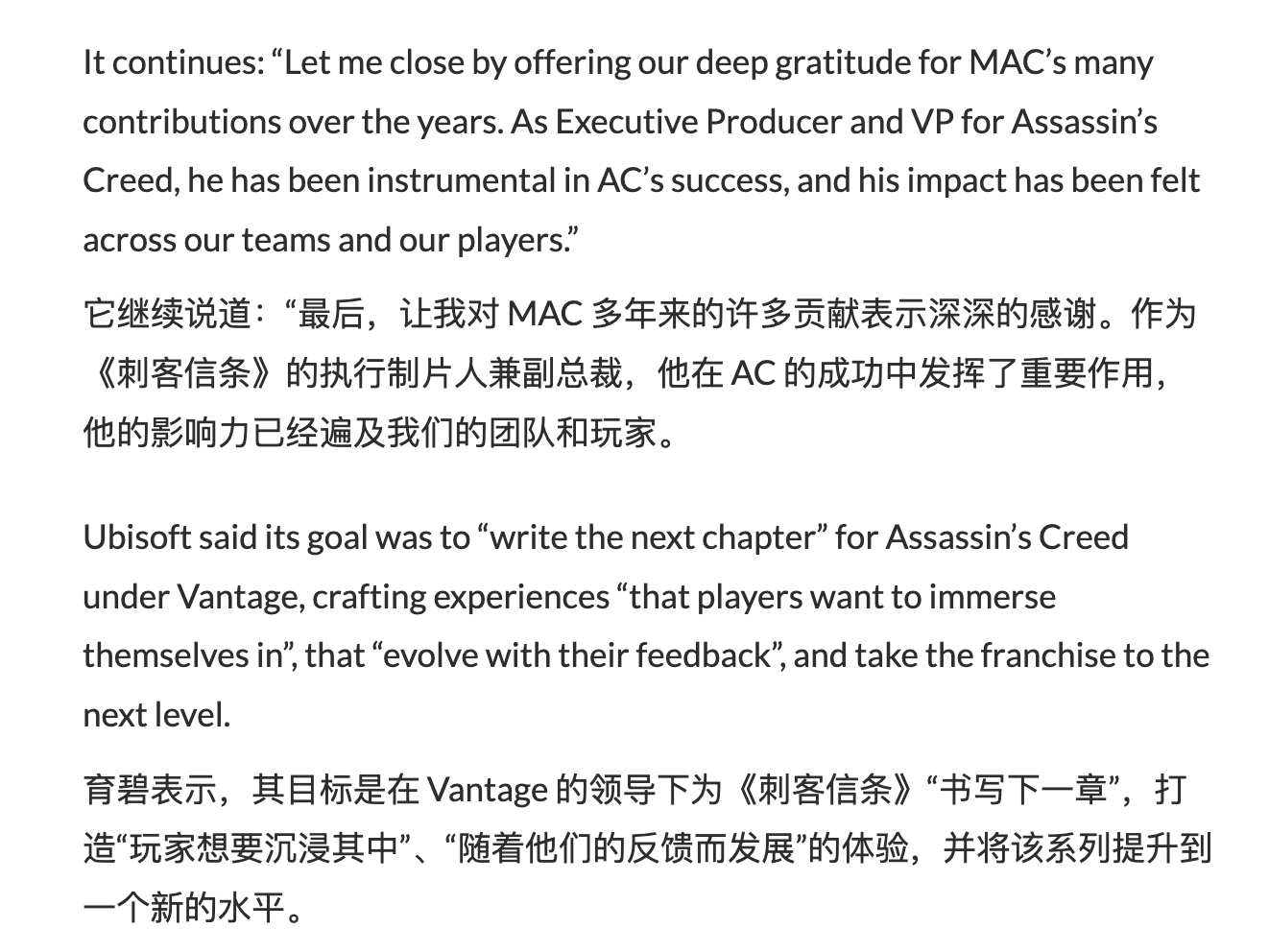 另外育碧表示,现在的目标是在新公司Vantage Studios的指导下为《刺客信条》开启新篇章,打造“玩家想要沉浸其中”、“根据玩家反馈来发展”的游戏体验,并将《刺客信条》提升到一个全新水平。刺客信条
