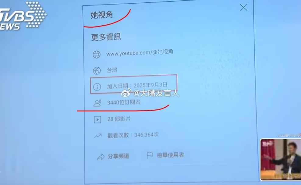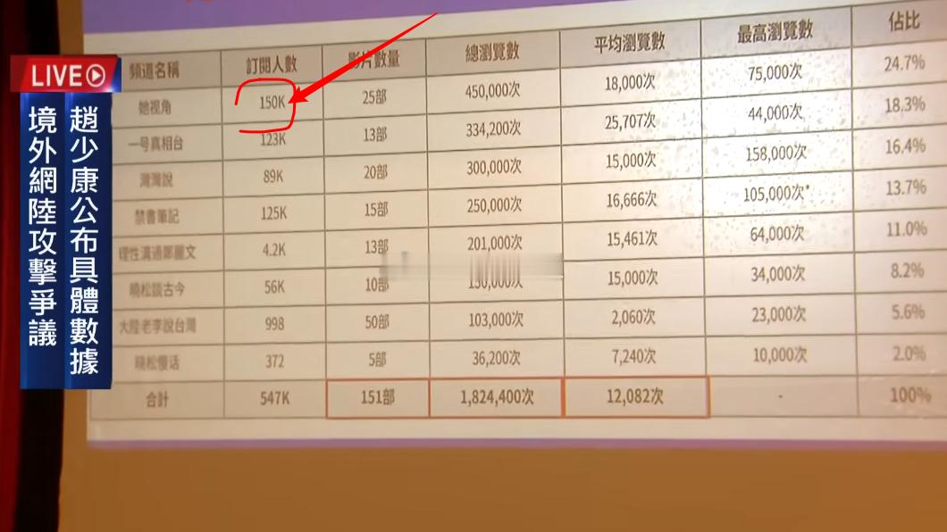 10月11日,黎少康和柳菜葳开记者会(图1图2),污蔑大陆网军介选,并当场提供了一些证据,如图3,这个油管频道“她视角”,此时显示3440位订阅者,10月12日少康和柳外出报警,10月13日少康继续开记者会展示数据,但13日的证据中,这个“她视角”频道的订阅者就被黎少康团队说成150K(15万,图4)了;11日少康展示“湾湾说”频道有订阅者4480人(图5),到了13日少康团队称这个频道有订阅者8.9万人(图6)[哈哈][哈哈]