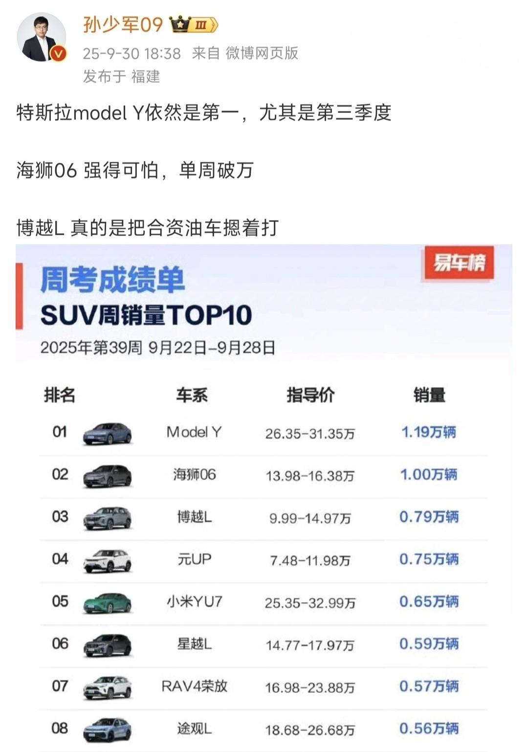 唉,特斯拉还是没有对手啊。 第2,海狮06,卖了1万辆 第3,博越L,卖了0.79万辆 第4,元UP,卖了0.75万辆 最后从名单中可以发现一个细节,十款车只有3款车是纯电,其它7款车需要烧油,说明大部分车企在中高端纯电市场基本卖不动。如果进一步划分,十款车有5款新能源,5款纯燃油车,看来燃油车并没有想象中的那么拉胯,好在现在国产纯燃油车在销量上已经狠狠压制合资品牌。对此大家有什么看法呢。