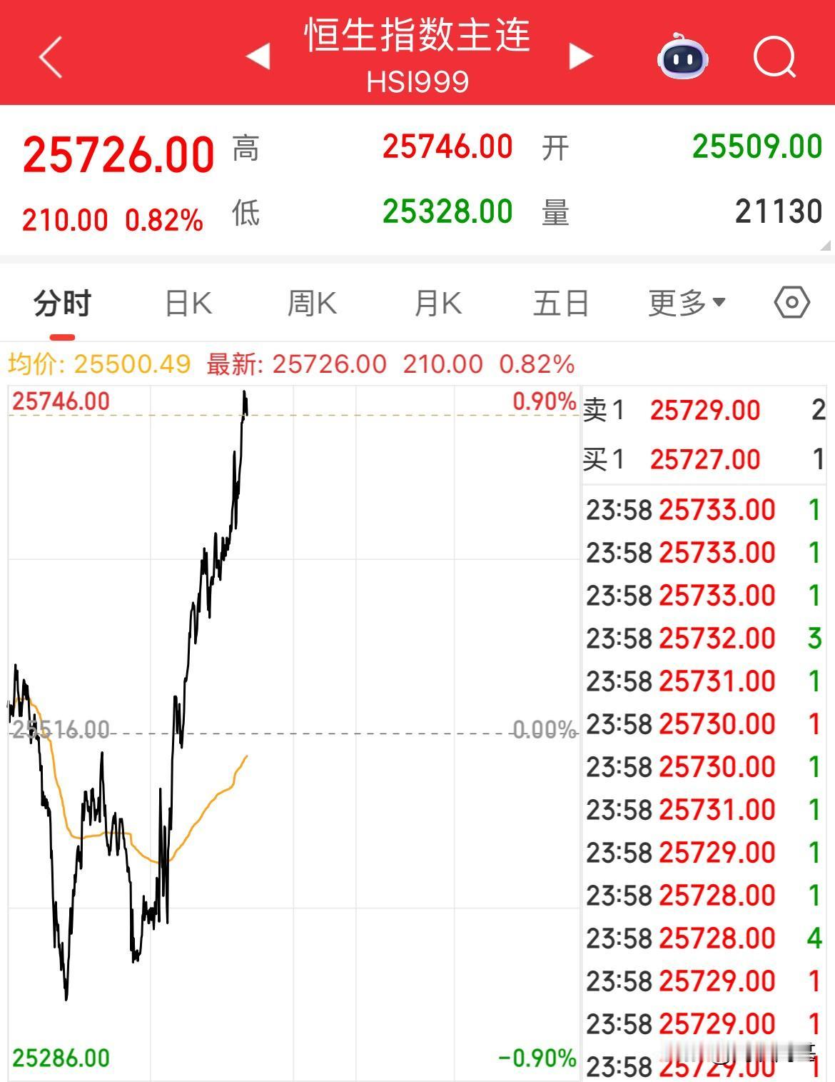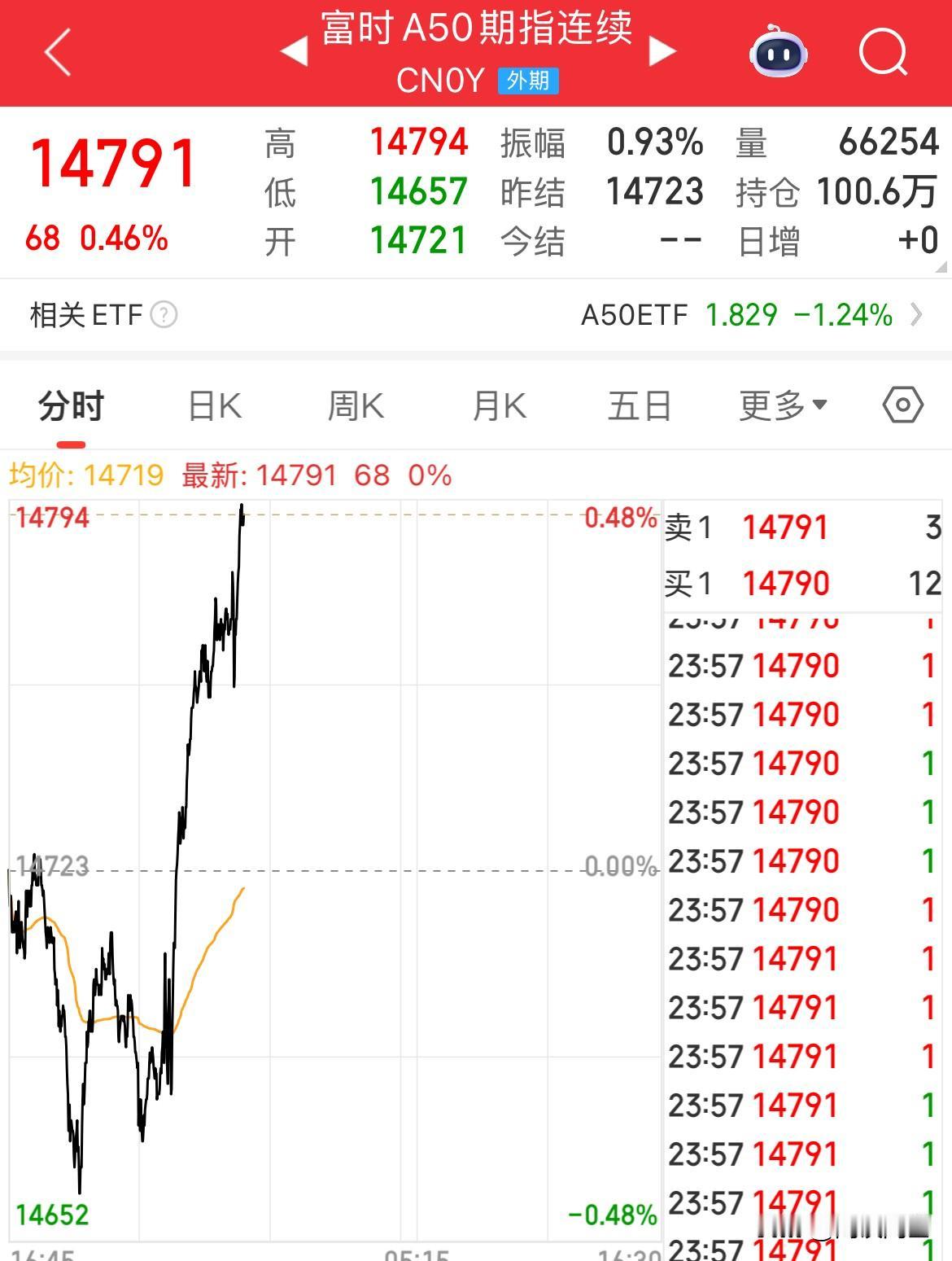 一到晚上就给希望呢,A50拉升上涨了,恒生指数期货也涨幅超0.8%,真是一到晚上