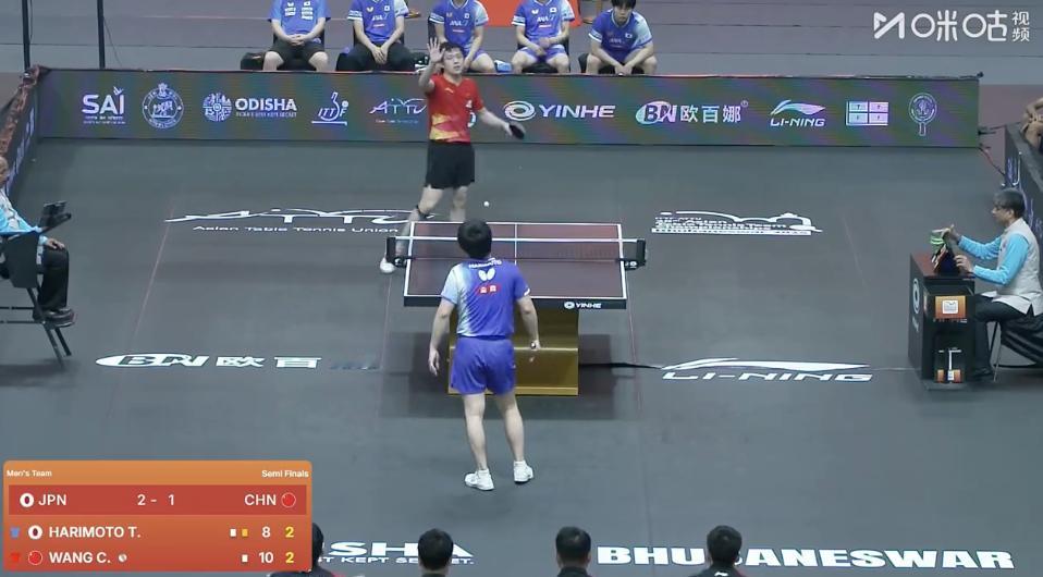 乒乓球亚锦赛男团半决赛,第四盘王楚钦3-2战胜张本智和,总比分中国队2-2日本队,双方进入决胜盘,比分:8-11、11-1、11-9、13-15、11-8,第五盘梁靖崑vs松岛辉空