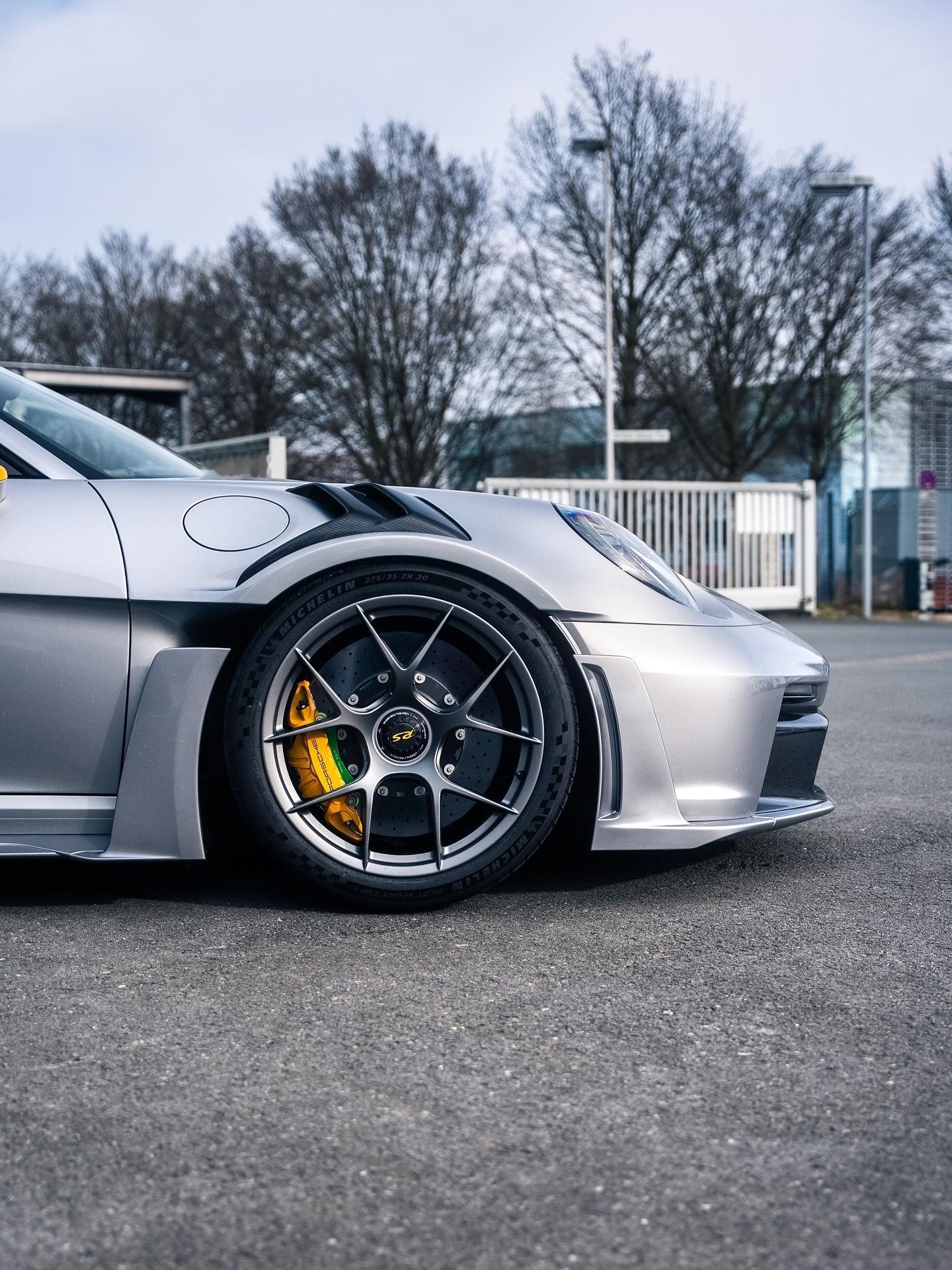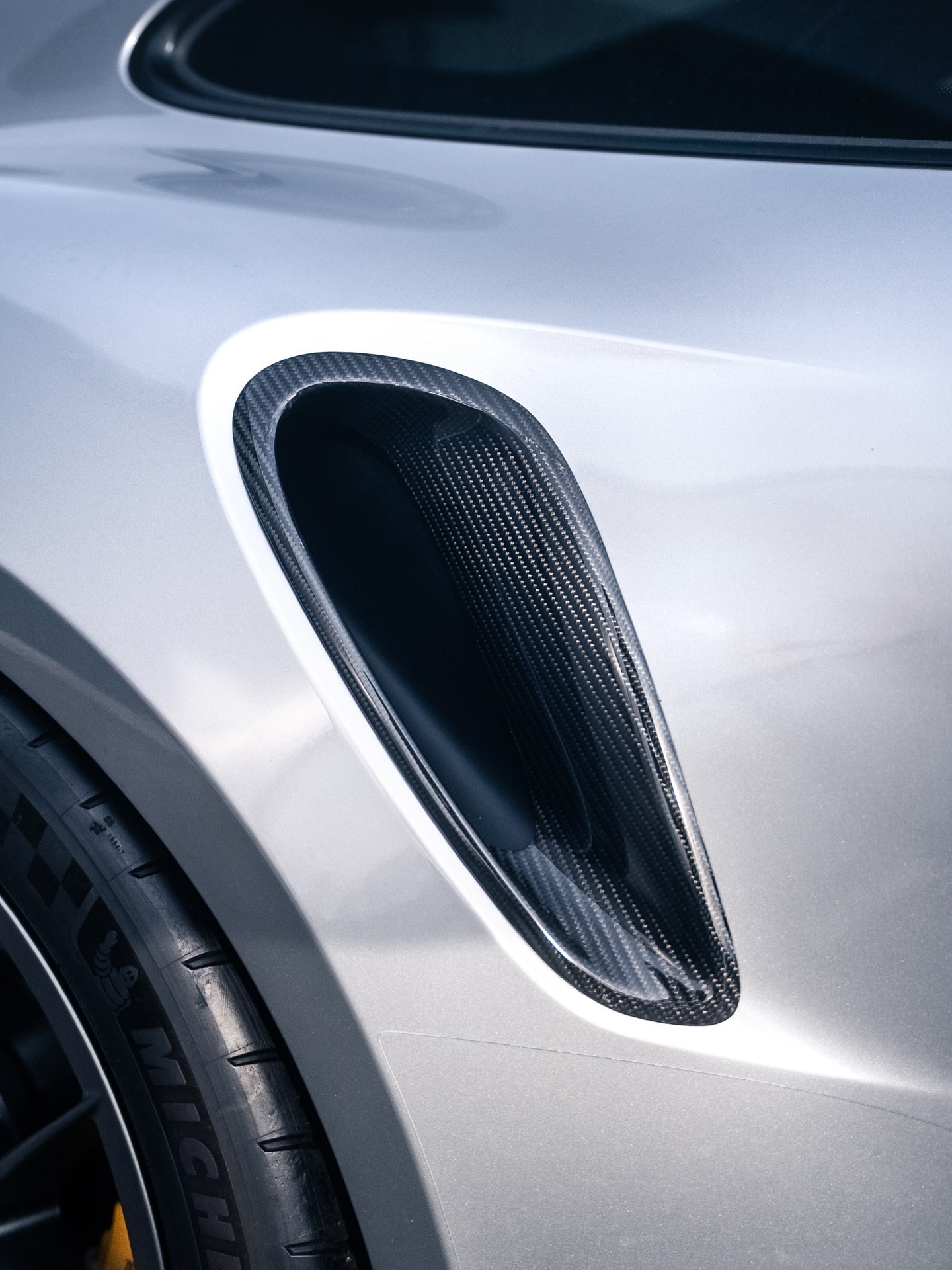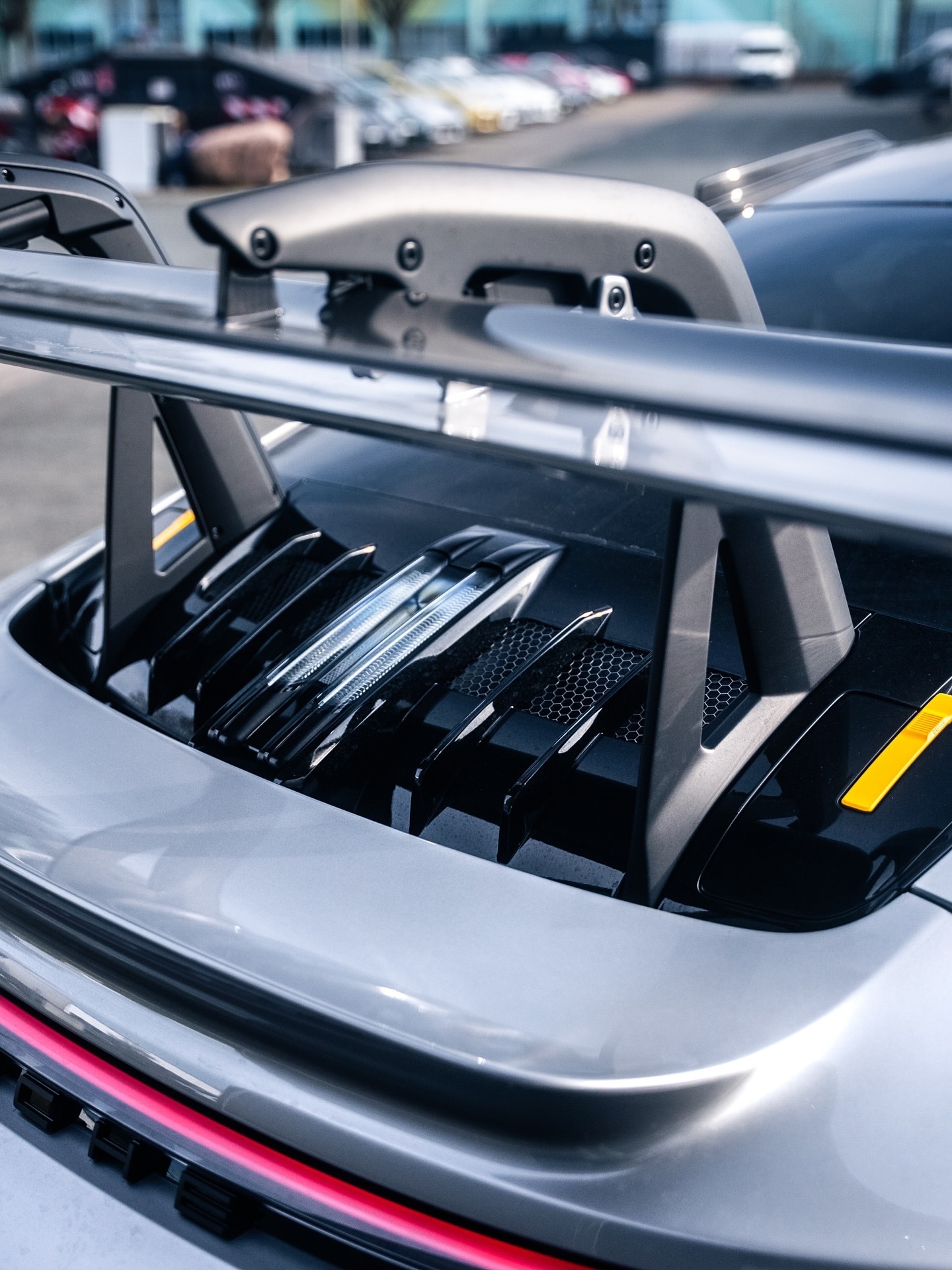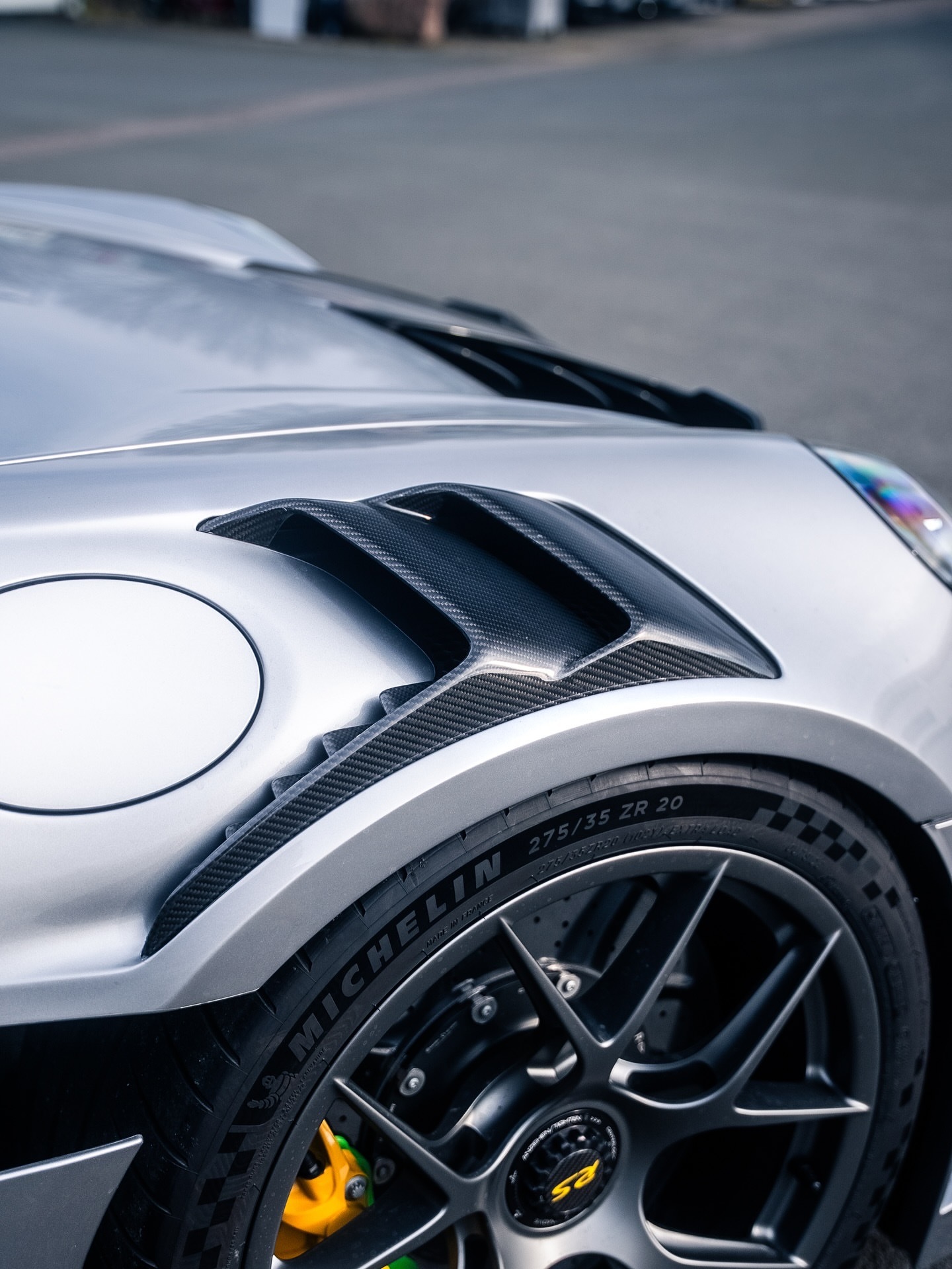 在这款992 GT3 RS上,每一个塑料部件要么被碳纤维替代,要么漆成车身同色,要么是哑光黑色。
