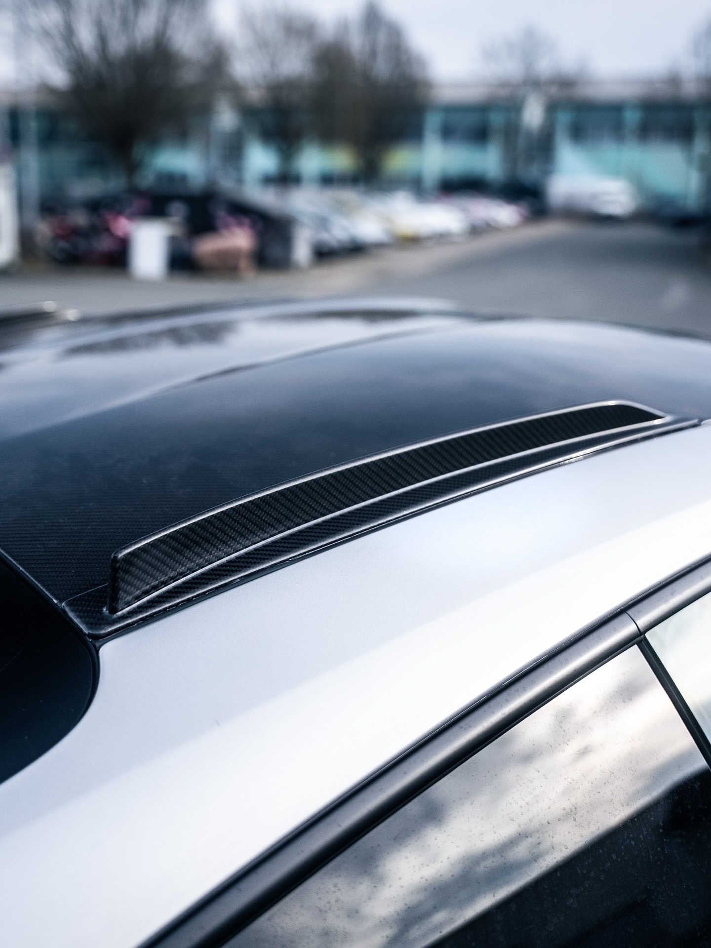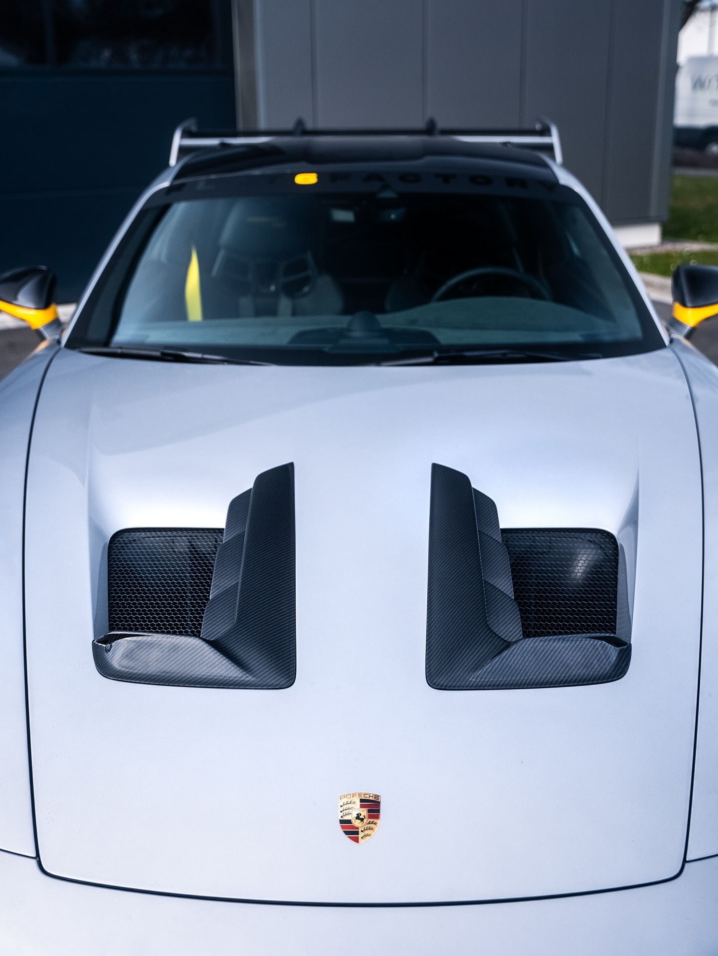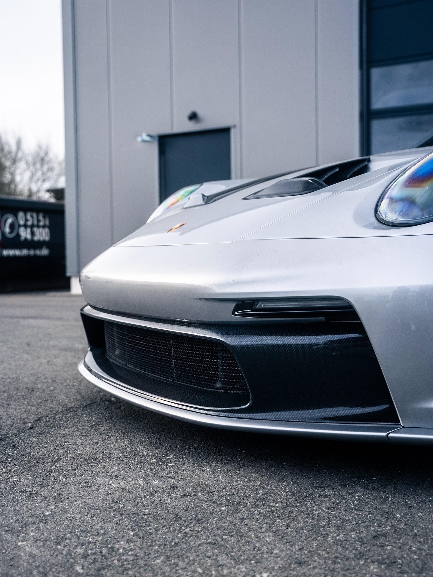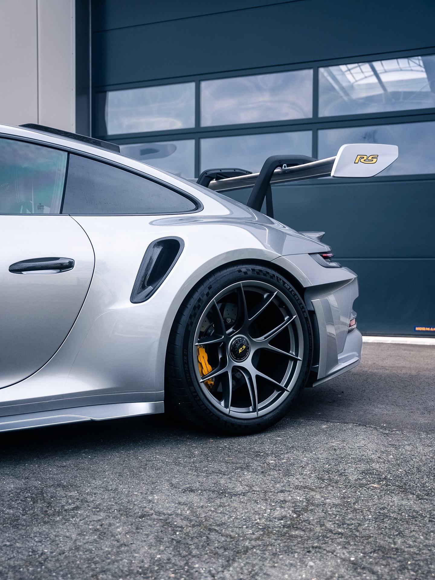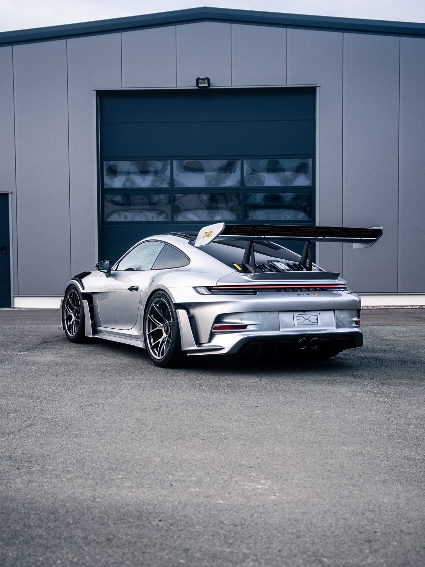 在这款992 GT3 RS上,每一个塑料部件要么被碳纤维替代,要么漆成车身同色,要么是哑光黑色。