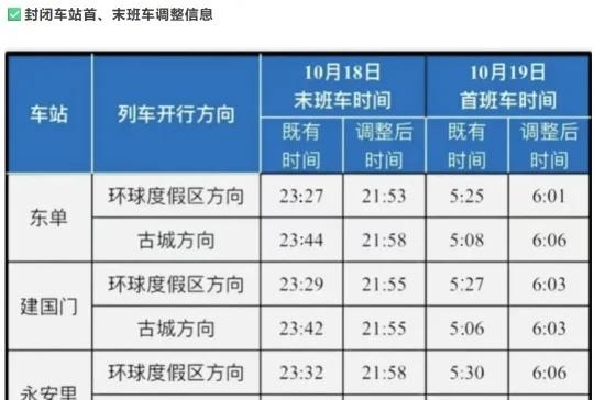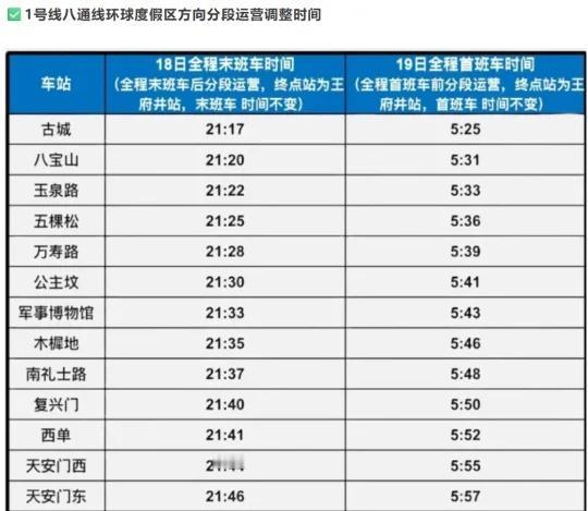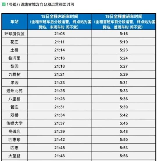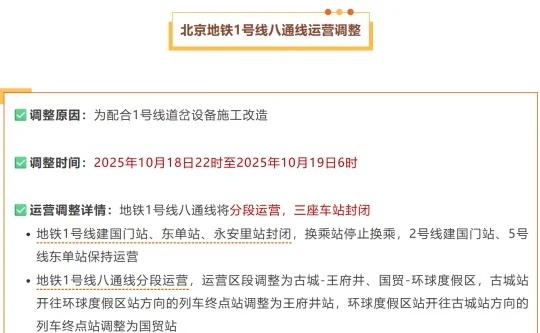 北京地铁1号线八通线,本周末运营有变! ✅为配合1号线道岔设备施工改造,2025年10月18日22时至2025年10月19日6时,地铁1号线八通线将分段运营,三座车站封闭。 ✅地铁1号线建国门站、东单站、永安里站封闭,换乘站停止换乘,2号线建国门站、5号线东单站保持运营; ✅地铁1号线八通线分段运营,运营区段调整为古城-王府井、国贸-环球度假区,古城站开往环球度假区站方向的列车终点站调整为王府井站,环球度假区站开往古城站方向的列车终点站调整为国贸站,请乘客合理安排出行。 ✅调整时刻表:图3-图5 ✅内容 北京地铁运营 北京地铁1号线 北京地铁1号线八通线 八通线 地铁
