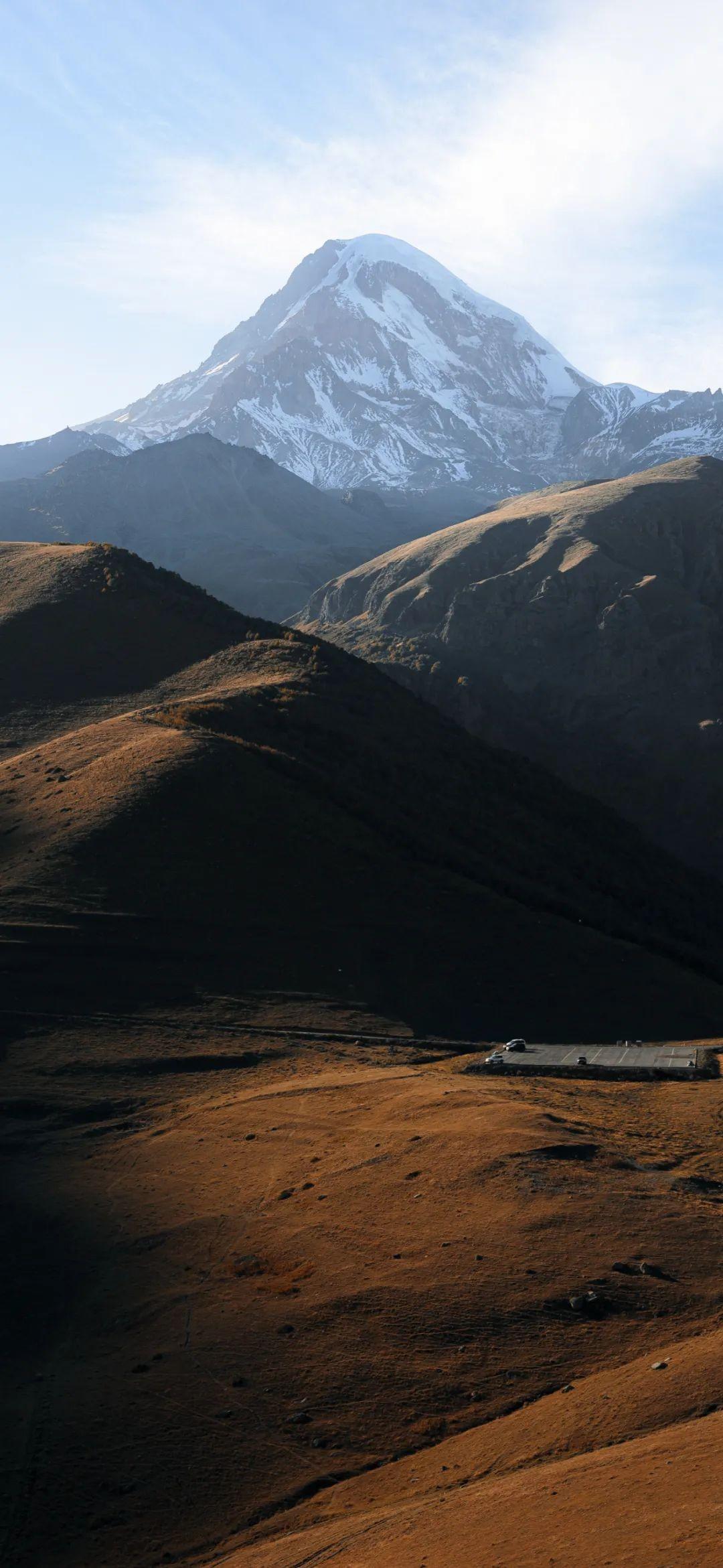 这张壁纸一眼就爱了。 清透的天色铺开,远处雪峰安静矗立,冷蓝与暖棕在山谷交替,像清晨第一口凉风。阳光扫过起伏的丘陵,阴影有层次,线条柔和不凌厉。低饱和的色彩很耐看,看久了心也慢下来,适合做桌面静静呼吸。 冷暖对撞的自然配色,极简风的治愈风景。 手机壁纸 风景