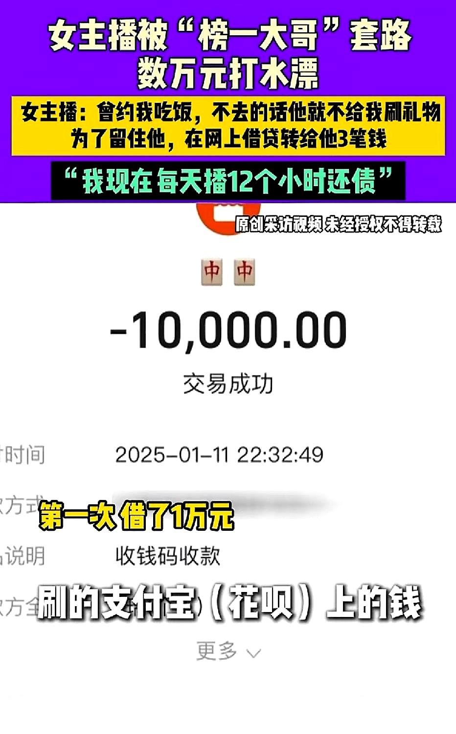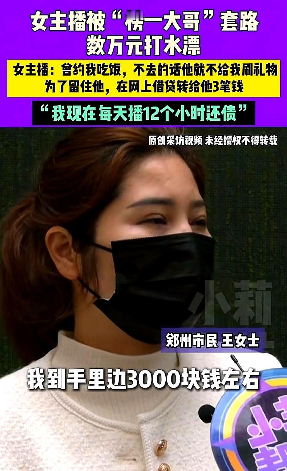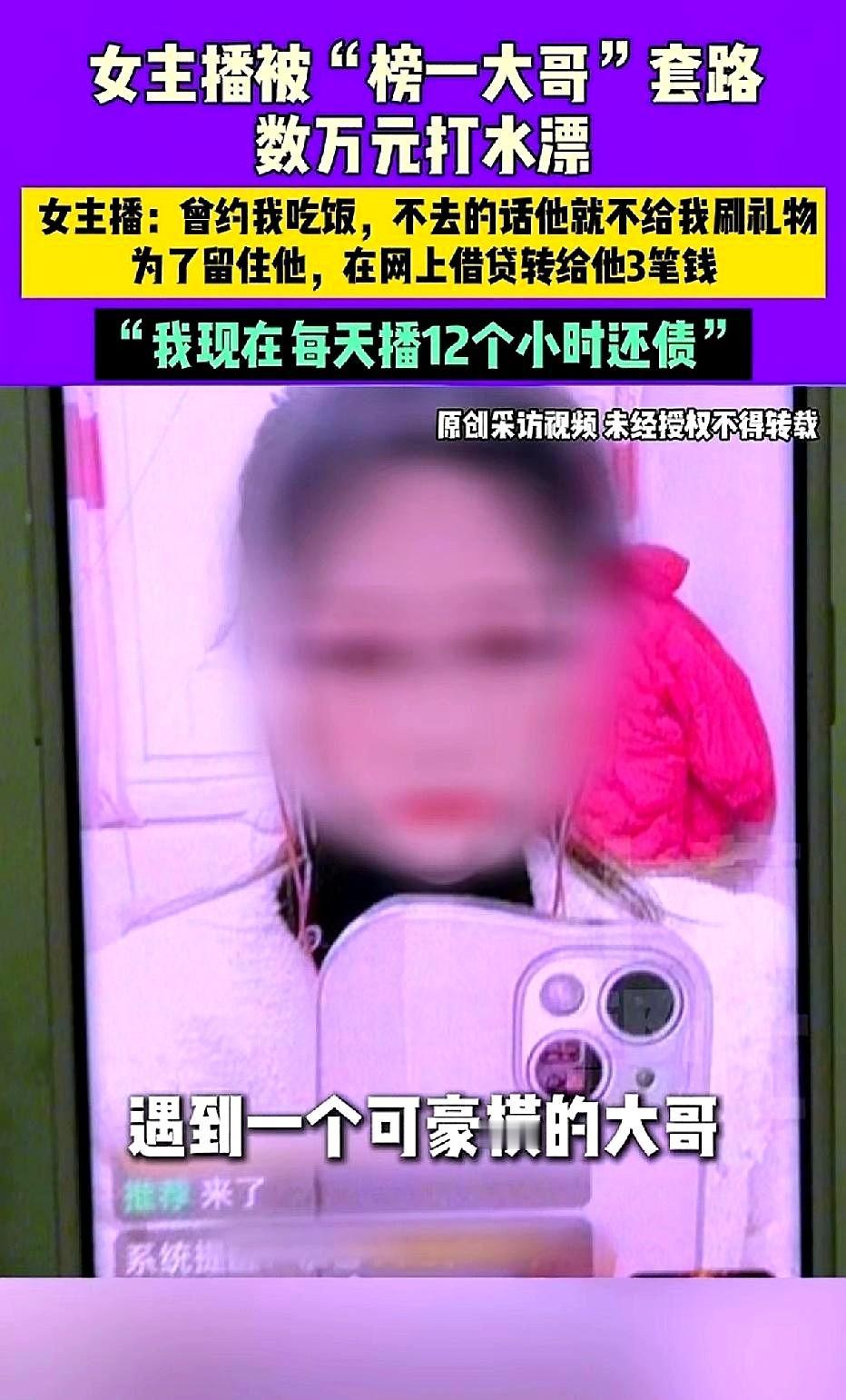 女子做主播半月,遇“榜一大哥”助力赚3000元。 二十几天后,大哥要求见面,否则不刷礼物。 女子赴约后,大哥以投资为由,先后向女子借走1万、2.5万、2.1万,共5.6万元。 此后大哥失联,女子日播12小时还债。 网友对此表达观点:贪婪之心作祟,掉进榜一大哥陷阱。 主播们要时刻警惕,不是每个“榜一大哥”都是富豪,也许是骗子。 稀奇啊,以前都是大哥被坑,现在看到大哥坑主播的[捂脸][捂脸][捂脸][捂脸][捂脸]就算大哥是个骗子,也不不同情主播哈 遇到茬子了,就是给她下套啊,这女主播出去只是跟大哥吃个饭,然后就会借给大哥钱吗?她自己信了,网友可是不信[笑哭][笑哭][笑哭][笑哭][笑哭] 这位男子的做法值得每一位人学习,都如果这样做了,以后直播行业就可以少霍霍多少人了。 哈哈现在男人不好骗了。女人天天直播大哥大哥的叫,明白人都知道想钱想疯了。现在有的女主播改叫爷爷叫爹了。可是你想钱,男人好色更喜欢钱。你骗我我骗你就看谁上当受骗。