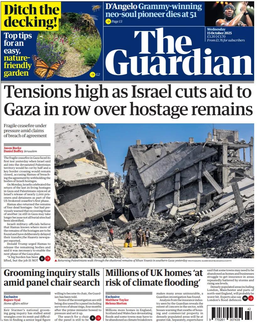 10月15日《卫报》报道称,以色列与哈马斯之间的停火协议在有违反协议的指控后已经面临压力。报道称,由于关于人质遗体归还的争议,以色列已切断对加沙的援助。