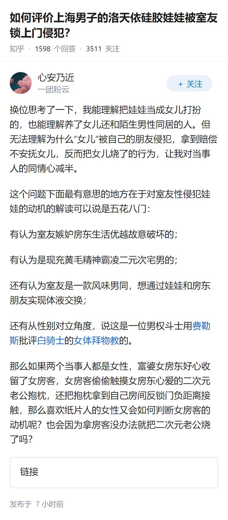 如何评价上海男子的洛天依硅胶娃娃被室友锁上门侵犯?
