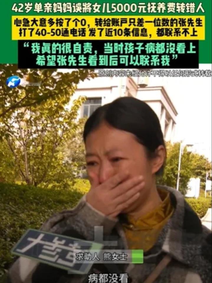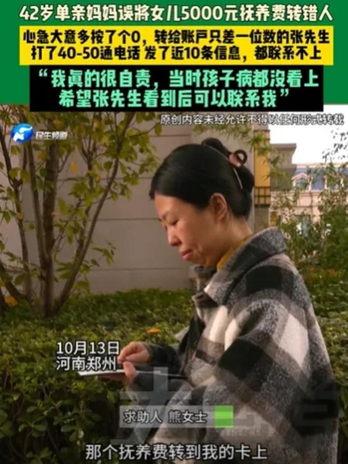 河南郑州,42岁单亲妈妈带女儿看病,转账付费时,竟然多按了个0,误将女儿5000元抚养费转错人,转给账户只差一位数的张先生,她打了40-50通电话,发了近10条信息,对方都不回应!女子哭诉:我真的很自责,孩子病都没看上,希望能还给我,哪怕给你包个红包也可以!” 女子表示,她准备把抚养费转到卡上,给她看病用,自己不小心着急,然后点错了一个卡号,钱转错了,钱交不上,当时就把孩子带回家了。 她没办法,只能发信息,打字的时候手都在抖:“张先生您好,我是单亲妈妈,刚才转错钱了,那5000 块是我女儿的抚养费,要用来治病,求您把钱还回来,我给您包个大红包感谢!”可信息发出去,石沉大海。 孩子还询问:妈妈这个钱是不是要不回来了!无奈之下,女子只能求助媒体帮忙。 其实,这种情况在法律上叫“不当得利”--简单说,就是张先生没理由拿这笔钱,按法律规定必须还回来,就算他不配合,也能去法院起诉要回来。 有网友说“这个张先生也太缺德了,知道是孩子的救命钱还装死,不怕遭报应吗”。 老话说,君子爱财取之有道,张先生拿着别人的救命钱不还,不仅缺德,还违法。郑州这天气一冷,孩子生病本就遭罪,单亲妈妈一个人扛着家,5000块看着不多,却是孩子看病的救命钱,是能让孩子少受点苦的希望。换做谁,看到信息里“单亲妈妈”“孩子治病”这几个字,就算不立刻转回去,也该回个话吧?可张先生倒好,电话不接信息不回,这跟把别人的救命稻草攥手里不放有啥区别? 还有网友说,就算不懂法,也该有良心。现在媒体都帮忙了,要是张先生还装糊涂,真等法院找上门,不仅要还钱,名声也彻底臭了,值当吗?说不定他家里也有孩子,要是自家孩子遇到这事,他能不着急?做人总得将心比心,不能眼里只盯着那点钱,把良心给丢了。 各位读者你们怎么看?欢迎在评论区讨论。
