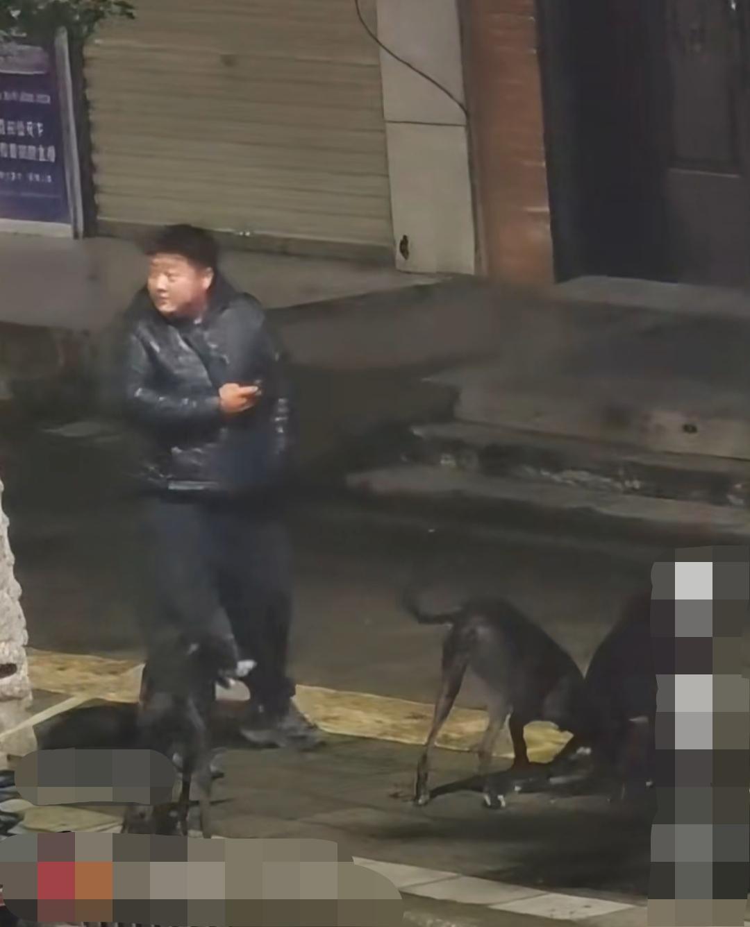 近日,河南漯河。深夜的大街上,三条大型恶犬撕咬流浪小狗,一旁的男子不仅视若无睹,