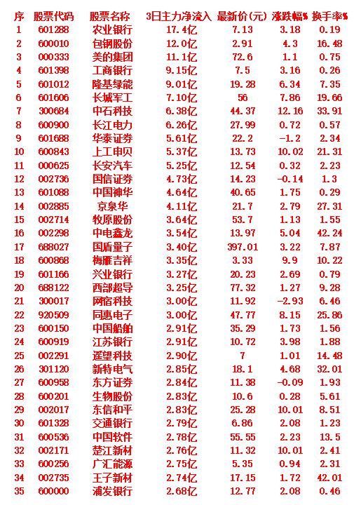 10月15日,前3天主力大幅买入的35名单! 农业银行:近3日主力净流入17.