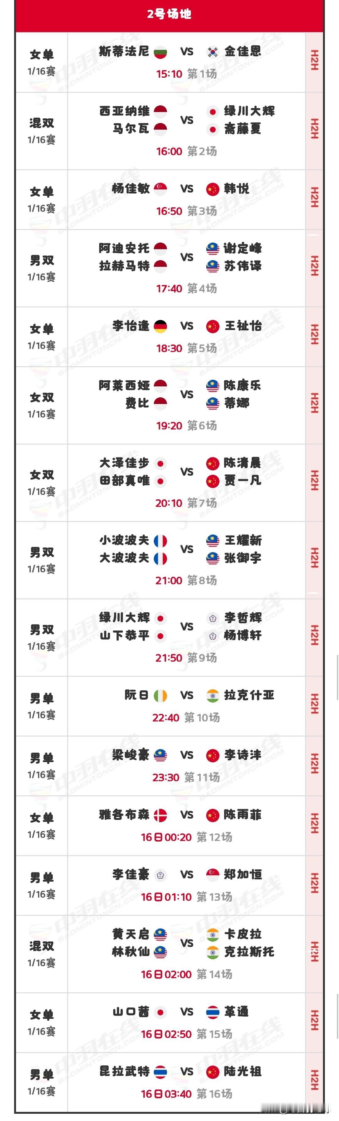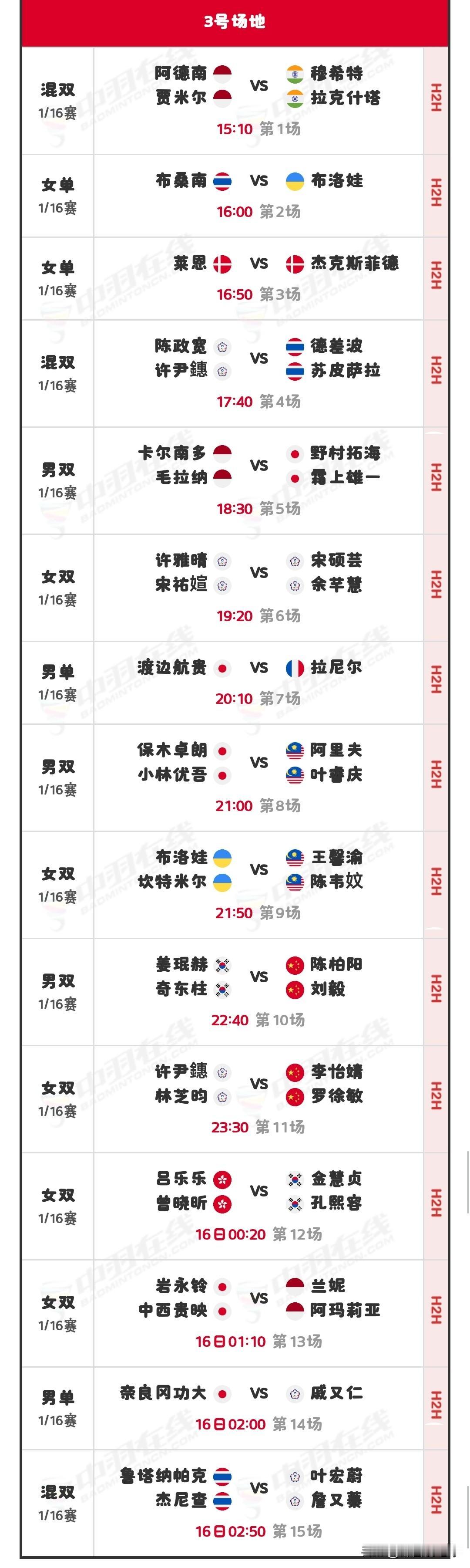 10月15日丹麦羽毛球公开赛1/16决赛(二)赛程安排 昨日,国羽在比赛中取得
