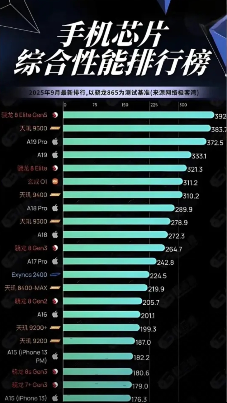 2025 手机芯片性能榜大洗牌! 2025 手机芯片性能榜大洗牌,骁龙 8 Elite Gen5 直接封神! 数码圈的小伙伴快看!2025 年 9 月最新手机芯片性能排行榜杀疯了,骁龙 8 Elite Gen5 以392 分的成绩一骑绝尘,把天玑 9500、苹果 A19 Pro 都甩在身后,这波操作属实让人大呼 “不讲武德”! 1、骁龙 8 Elite Gen5 直接登顶,性能碾压级存在; 2、天玑 9500 紧随其后,联发科这波也很猛; 3、苹果 A19 Pro、A19 分列第三、第四,果粉们怎么看? 4、咱们国产的玄戒 O1 也冲进前六,这波表现够亮眼! 这榜单是以骁龙 865 为测试基准的,能看出各家芯片的性能差距有多夸张。选手机时芯片性能可是核心指标,这波排行直接给大家购机指了明路! 你们觉得这波芯片性能排行合理吗?最近想换手机的,会优先考虑哪款芯片的机型?